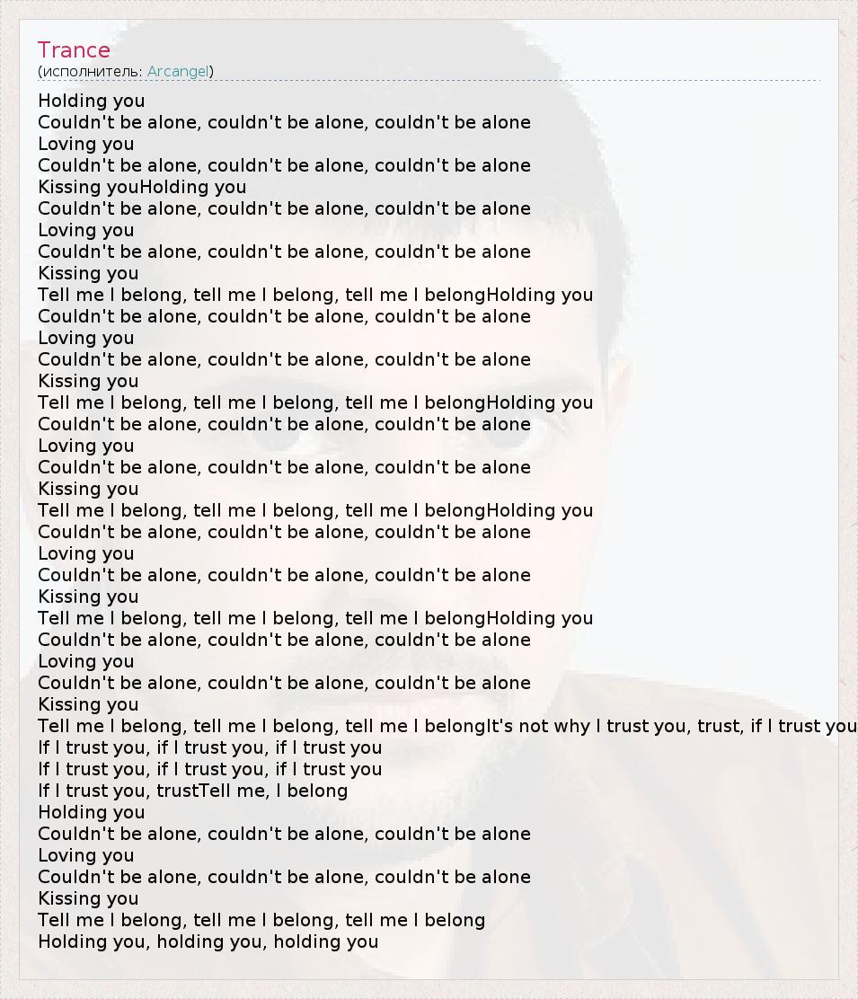 Holding you Couldn't be alone, couldn't be alone, couldn't be alone Loving you Couldn't be alone, couldn't be alone, couldn't be alone Kissing youHolding you Couldn't be alone, couldn't be alone, couldn't be alone Loving you Couldn't be alone, couldn't be alone, couldn't be alone Kissing you Tell me I belong, tell me I belong, tell me I belongHolding you Couldn't be alone, couldn't be alone, couldn't be alone Loving you Couldn't be alone, couldn't be alone, couldn't be alone Kissing you Tell me I belong, tell me I belong, tell me I belongHolding you Couldn't be alone, couldn't be alone, couldn't be alone Loving you Couldn't be alone, couldn't be alone, couldn't be alone Kissing you Tell me I belong, tell me I belong, tell me I belongHolding you Couldn't be alone, couldn't be alone, couldn't be alone Loving you Couldn't be alone, couldn't be alone, couldn't be alone Kissing you Tell me I belong, tell me I belong, tell me I belongHolding you Couldn't be alone, couldn't be alone, couldn't be alone Loving you Couldn't be alone, couldn't be alone, couldn't be alone Kissing you Tell me I belong, tell me I belong, tell me I belongIt's not why I trust you, trust, if I trust you If I trust you, if I trust you, if I trust you If I trust you, if I trust you, if I trust you If I trust you, trustTell me, I belong Holding you Couldn't be alone, couldn't be alone, couldn't be alone Loving you Couldn't be alone, couldn't be alone, couldn't be alone Kissing you Tell me I belong, tell me I belong, tell me I belong Holding you, holding you, holding you