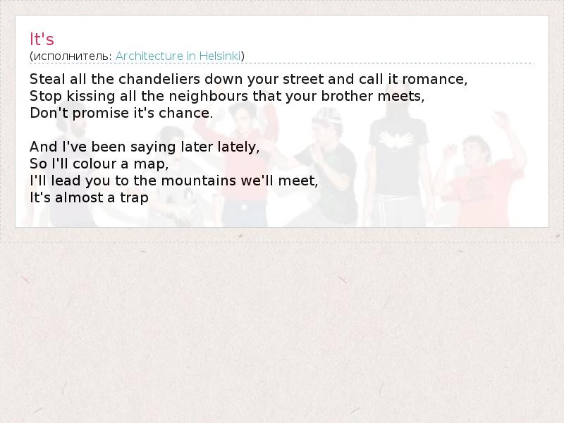 Steal all the chandeliers down your street and call it romance, Stop kissing all the neighbours that your brother meets, Don't promise it's chance. And I've been saying later lately, So I'll colour a map, I'll lead you to the mountains we'll meet, It's almost a trap