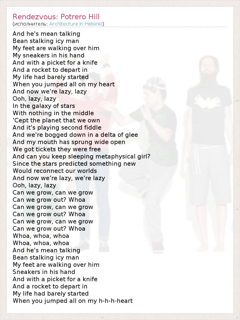 And he's mean talking Bean stalking icy man My feet are walking over him My sneakers in his hand And with a picket for a knife And a rocket to depart in My life had barely started When you jumped all on my heart And now we're lazy, lazy Ooh, lazy, lazy In the galaxy of stars With nothing in the middle 'Cept the planet that we own And it's playing second fiddle And we're bogged down in a delta of glee And my mouth has sprung wide open We got tickets they were free And can you keep sleeping metaphysical girl? Since the stars predicted something new Would reconnect our worlds And now we're lazy, we're lazy Ooh, lazy, lazy Can we grow, can we grow Can we grow out? Whoa Can we grow, can we grow Can we grow out? Whoa Can we grow, can we grow Can we grow out? Whoa Whoa, whoa, whoa Whoa, whoa, whoa And he's mean talking Bean stalking icy man My feet are walking over him Sneakers in his hand And with a picket for a knife And a rocket to depart in My life had barely started When you jumped all on my h-h-h-heart