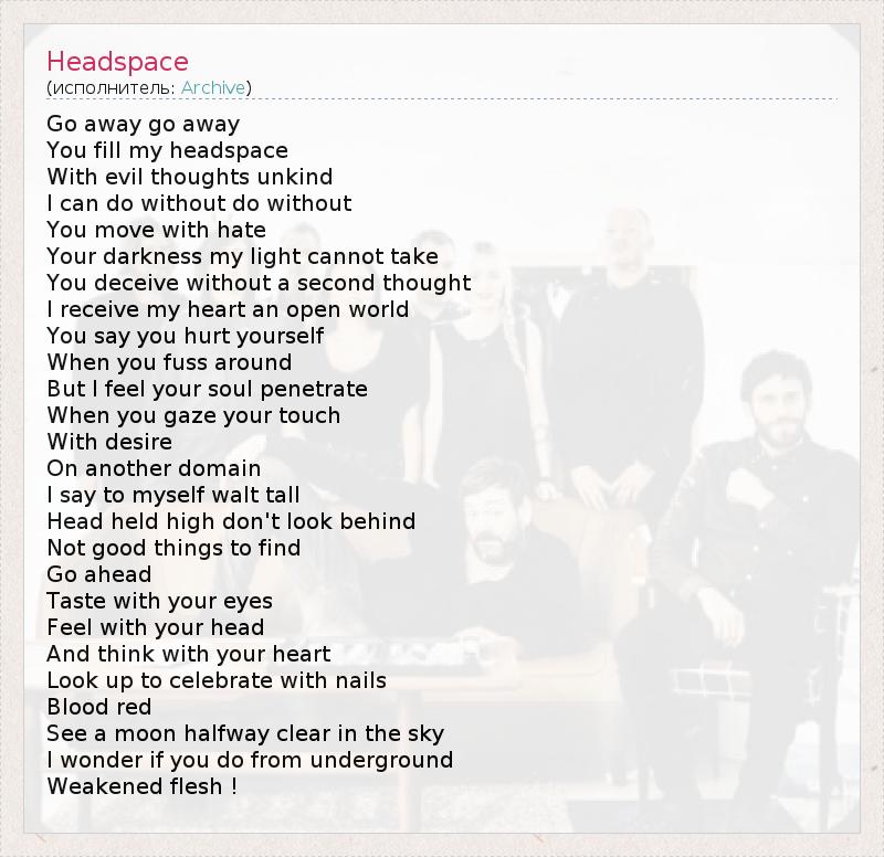Go away go away You fill my headspace With evil thoughts unkind I can do without do without You move with hate Your darkness my light cannot take You deceive without a second thought I receive my heart an open world You say you hurt yourself When you fuss around But I feel your soul penetrate When you gaze your touch With desire On another domain I say to myself walt tall Head held high don't look behind Not good things to find Go ahead Taste with your eyes Feel with your head And think with your heart Look up to celebrate with nails Blood red See a moon halfway clear in the sky I wonder if you do from underground Weakened flesh !