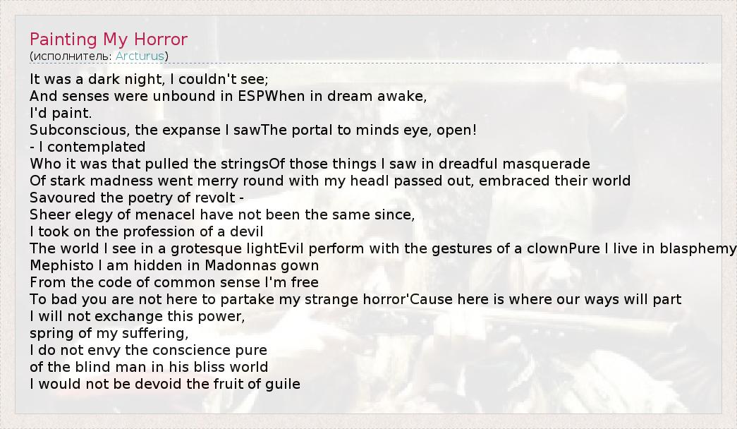 It was a dark night, I couldn't see; And senses were unbound in ESPWhen in dream awake, I'd paint. Subconscious, the expanse I sawThe portal to minds eye, open! - I contemplated Who it was that pulled the stringsOf those things I saw in dreadful masquerade Of stark madness went merry round with my headI passed out, embraced their world Savoured the poetry of revolt - Sheer elegy of menaceI have not been the same since, I took on the profession of a devil The world I see in a grotesque lightEvil perform with the gestures of a clownPure I live in blasphemy Mephisto I am hidden in Madonnas gown From the code of common sense I'm free To bad you are not here to partake my strange horror'Cause here is where our ways will part I will not exchange this power, spring of my suffering, I do not envy the conscience pure of the blind man in his bliss world I would not be devoid the fruit of guile