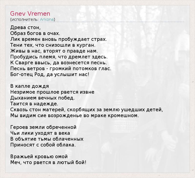 Аркона - Гнев времен http://megalyrics.ru/lyric/%D0%B0%D1%80%D0%BA%D0%BE%D0%BD%D0%B0/%D0%B3%D0%BD%D0%B5%D0%B2-%D0%B2%D1%80%D0%B5%D0%BC%D0%B5%D0%BD.htm#ixzz22xSvXAo2
