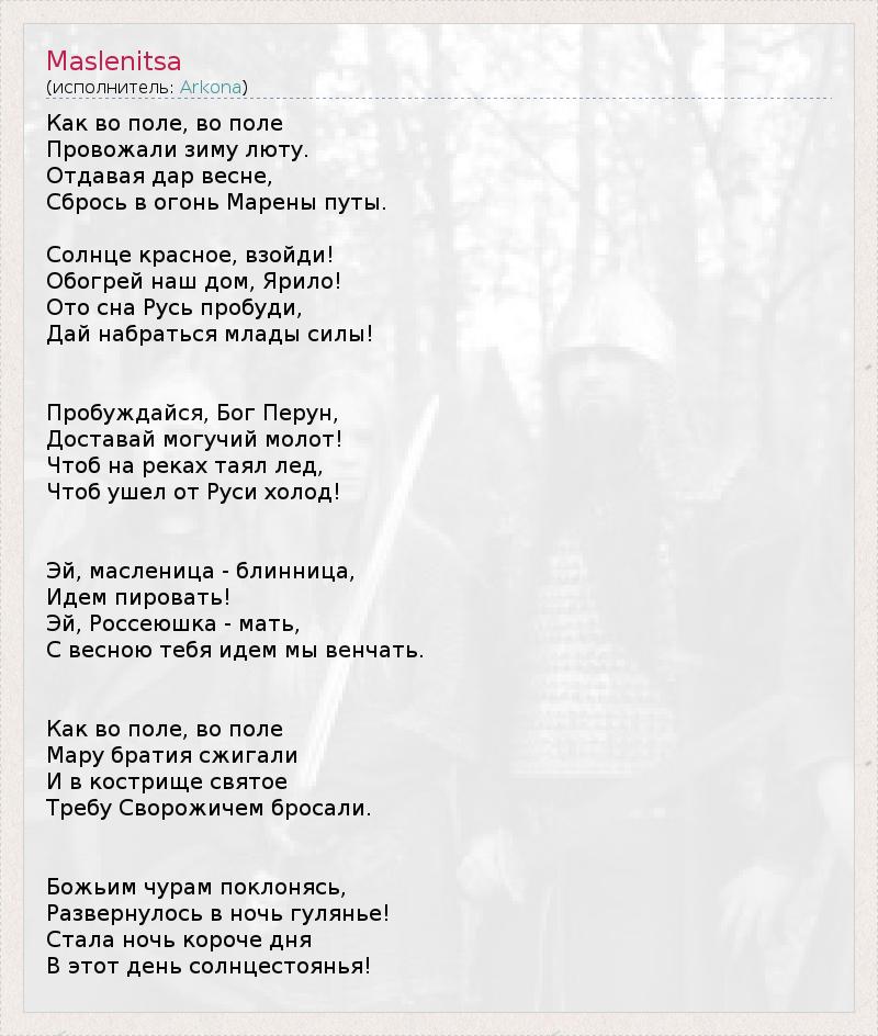 Аркона - Масленица http://megalyrics.ru/lyric/%D0%B0%D1%80%D0%BA%D0%BE%D0%BD%D0%B0/%D0%BC%D0%B0%D1%81%D0%BB%D0%B5%D0%BD%D0%B8%D1%86%D0%B0.htm#ixzz22rqrFbQ6
