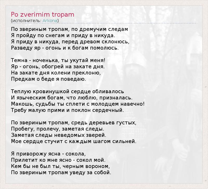 По звериным тропам, по дремучим следам Я пройду по снегам и приду в никуда. Я приду в никуда, перед древом склонюсь, Разведу яр - огонь и к богам помолюсь. Темна - ноченька, ты укутай меня! Яр - огонь, обогрей на закате дня. На закате дня колени преклоню, Предкам о беде я поведаю. Теплую кровинушкой сердце обливалось И языческим богам, что люблю, призналась. Макошь, судьбы ты сплети с молодцем навечно! Требу малую прими и поклон сердечный. По звериным тропам, средь деревьев густых, Пробегу, пролечу, заметая следы. Заметая следы неведомых зверей. Мое сердце стучит с каждым шагом сильней. Я приворожу ясна - сокола, Прилетит ко мне ясно - сокол мой. Кем бы не был ты, черным вороном, По звериным тропам уведу за собой. Аркона - По звериным тропам http://megalyrics.ru/lyric/%D0%B0%D1%80%D0%BA%D0%BE%D0%BD%D0%B0/%D0%BF%D0%BE-%D0%B7%D0%B2%D0%B5%D1%80%D0%B8%D0%BD%D1%8B%D0%BC-%D1%82%D1%80%D0%BE%D0%BF%D0%B0%D0%BC.htm#ixzz22xSnDcU4