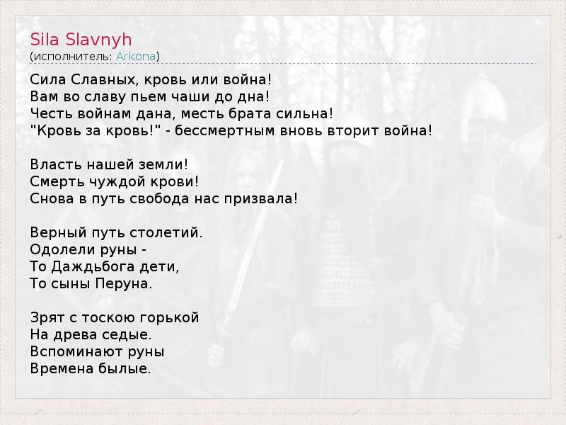 Аркона - Сила славных http://megalyrics.ru/lyric/%D0%B0%D1%80%D0%BA%D0%BE%D0%BD%D0%B0/%D1%81%D0%B8%D0%BB%D0%B0-%D1%81%D0%BB%D0%B0%D0%B2%D0%BD%D1%8B%D1%85.htm#ixzz22xT9v3wz