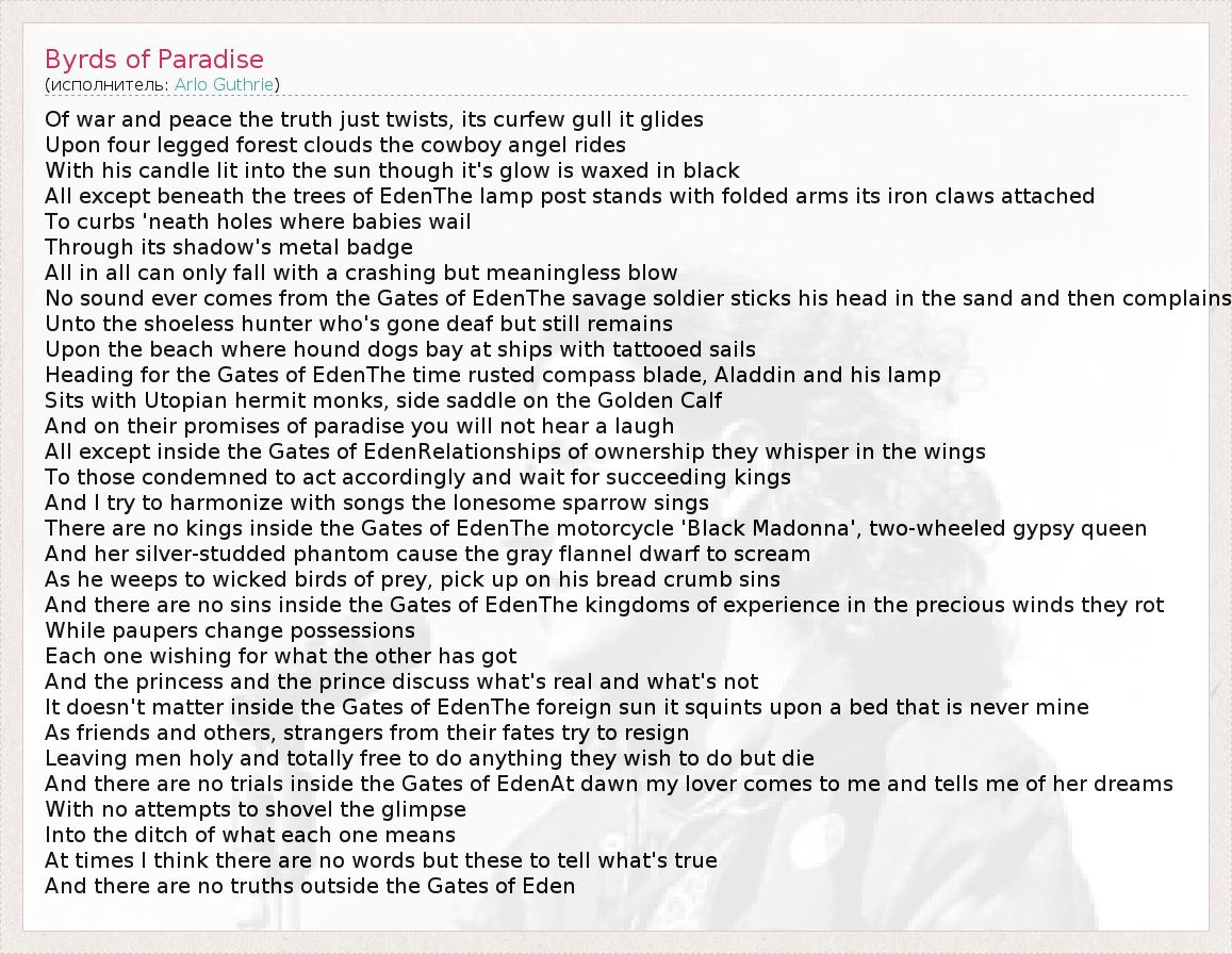 Of war and peace the truth just twists, its curfew gull it glides Upon four legged forest clouds the cowboy angel rides With his candle lit into the sun though it's glow is waxed in black All except beneath the trees of EdenThe lamp post stands with folded arms its iron claws attached To curbs 'neath holes where babies wail Through its shadow's metal badge All in all can only fall with a crashing but meaningless blow No sound ever comes from the Gates of EdenThe savage soldier sticks his head in the sand and then complains Unto the shoeless hunter who's gone deaf but still remains Upon the beach where hound dogs bay at ships with tattooed sails Heading for the Gates of EdenThe time rusted compass blade, Aladdin and his lamp Sits with Utopian hermit monks, side saddle on the Golden Calf And on their promises of paradise you will not hear a laugh All except inside the Gates of EdenRelationships of ownership they whisper in the wings To those condemned to act accordingly and wait for succeeding kings And I try to harmonize with songs the lonesome sparrow sings There are no kings inside the Gates of EdenThe motorcycle 'Black Madonna', two-wheeled gypsy queen And her silver-studded phantom cause the gray flannel dwarf to scream As he weeps to wicked birds of prey, pick up on his bread crumb sins And there are no sins inside the Gates of EdenThe kingdoms of experience in the precious winds they rot While paupers change possessions Each one wishing for what the other has got And the princess and the prince discuss what's real and what's not It doesn't matter inside the Gates of EdenThe foreign sun it squints upon a bed that is never mine As friends and others, strangers from their fates try to resign Leaving men holy and totally free to do anything they wish to do but die And there are no trials inside the Gates of EdenAt dawn my lover comes to me and tells me of her dreams With no attempts to shovel the glimpse Into the ditch of what each one means At times I think there are no words but these to tell what's true And there are no truths outside the Gates of Eden