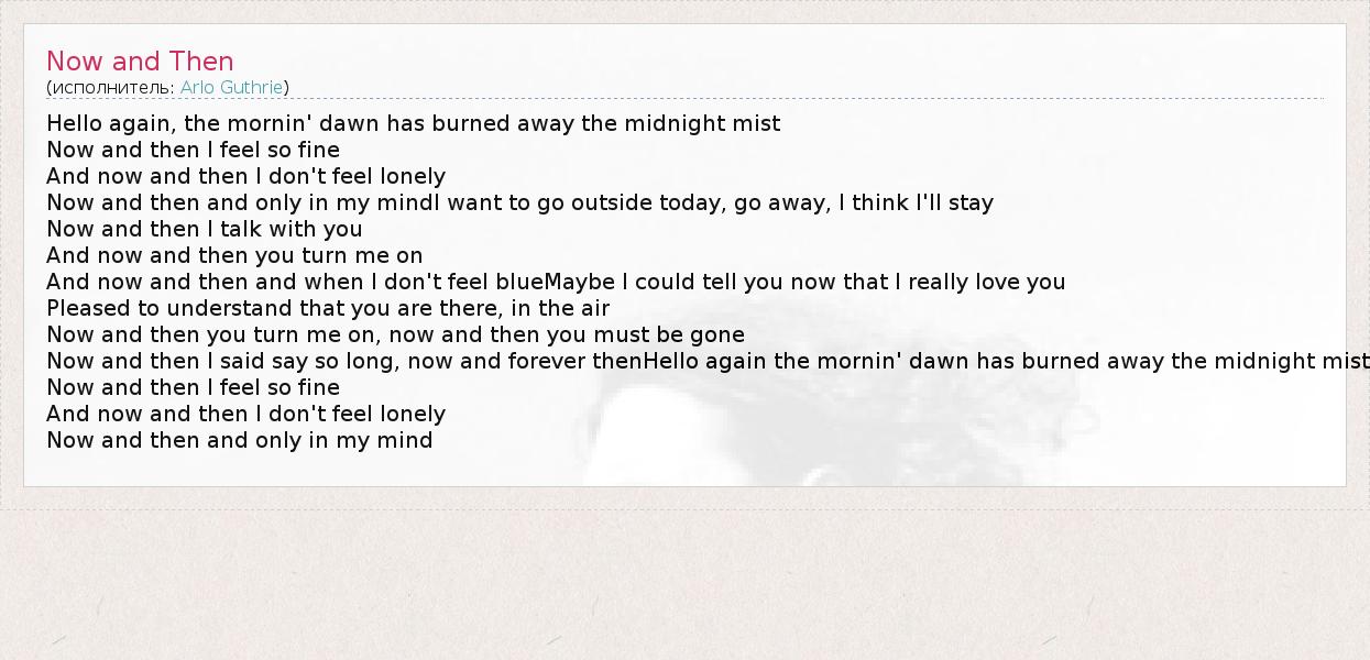 Hello again, the mornin' dawn has burned away the midnight mist Now and then I feel so fine And now and then I don't feel lonely Now and then and only in my mindI want to go outside today, go away, I think I'll stay Now and then I talk with you And now and then you turn me on And now and then and when I don't feel blueMaybe I could tell you now that I really love you Pleased to understand that you are there, in the air Now and then you turn me on, now and then you must be gone Now and then I said say so long, now and forever thenHello again the mornin' dawn has burned away the midnight mist Now and then I feel so fine And now and then I don't feel lonely Now and then and only in my mind