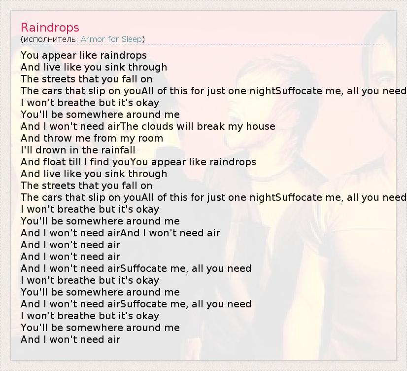 You appear like raindrops And live like you sink through The streets that you fall on The cars that slip on youAll of this for just one nightSuffocate me, all you need I won't breathe but it's okay You'll be somewhere around me And I won't need airThe clouds will break my house And throw me from my room I'll drown in the rainfall And float till I find youYou appear like raindrops And live like you sink through The streets that you fall on The cars that slip on youAll of this for just one nightSuffocate me, all you need I won't breathe but it's okay You'll be somewhere around me And I won't need airAnd I won't need air And I won't need air And I won't need air And I won't need airSuffocate me, all you need I won't breathe but it's okay You'll be somewhere around me And I won't need airSuffocate me, all you need I won't breathe but it's okay You'll be somewhere around me And I won't need air