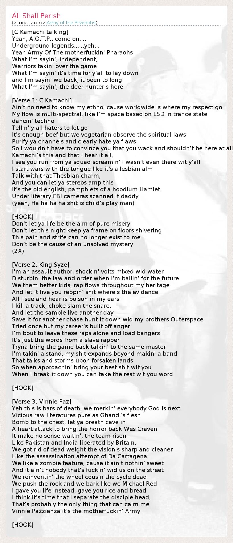 Это интересно:Родом из Philadelphia, PAКоллектив существует с 1998 года до настоящего времениЖанр: underground hip-hop, hardcore rapЗвукозаписывающий лэйбл: Babygrande Records, Enemy SoilВ состав группы входят: Vinnie Paz, Jus Allah, MC Esoteric (7L & Esoteric), Apathy, Celph Titled, Crypt the Warchild, Planetary (оба из Outerspace), King Syze, Demoz, Reef the Lost Cauze, King Magnetic.Первоначальный состав Army of the Pharaohs был образован Jedi Mind Tricks в конце 90-х... продолжение