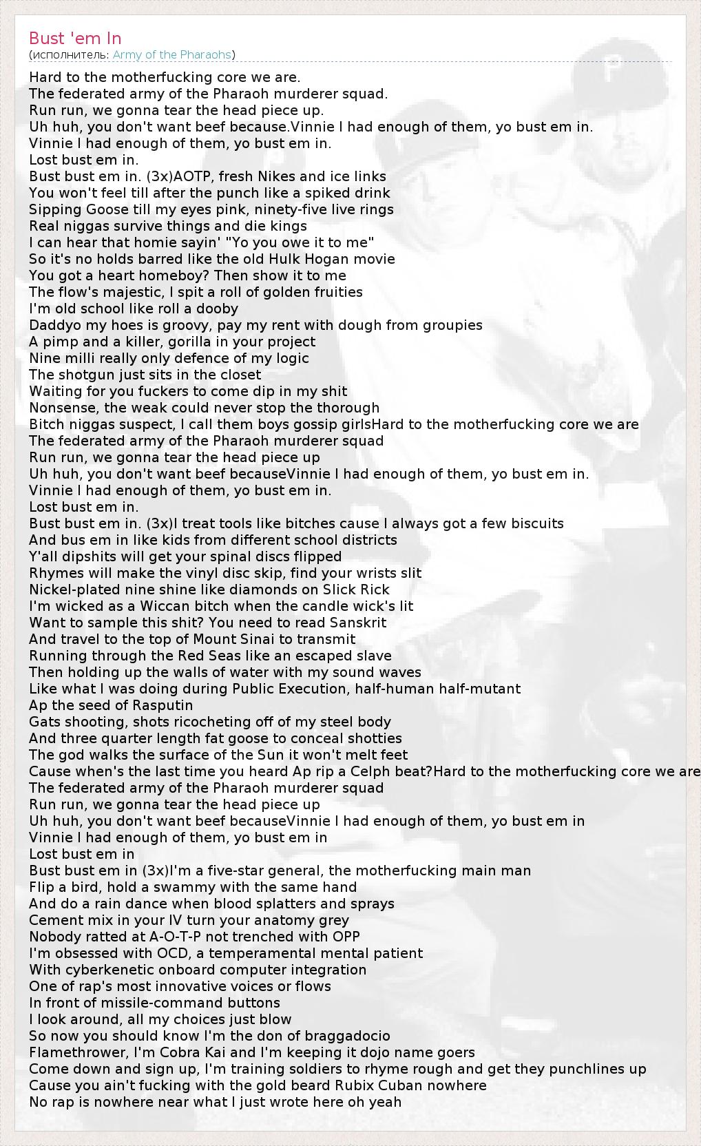 Hard to the motherfucking core we are. The federated army of the Pharaoh murderer squad. Run run, we gonna tear the head piece up. Uh huh, you don't want beef because.Vinnie I had enough of them, yo bust em in. Vinnie I had enough of them, yo bust em in. Lost bust em in. Bust bust em in. (3x)AOTP, fresh Nikes and ice links You won't feel till after the punch like a spiked drink Sipping Goose till my eyes pink, ninety-five live rings Real niggas survive things and die kings I can hear that homie sayin' "Yo you owe it to me" So it's no holds barred like the old Hulk Hogan movie You got a heart homeboy? Then show it to me The flow's majestic, I spit a roll of golden fruities I'm old school like roll a dooby Daddyo my hoes is groovy, pay my rent with dough from groupies A pimp and a killer, gorilla in your project Nine milli really only defence of my logic The shotgun just sits in the closet Waiting for you fuckers to come dip in my shit Nonsense, the weak could never stop the thorough Bitch niggas suspect, I call them boys gossip girlsHard to the motherfucking core we are The federated army of the Pharaoh murderer squad Run run, we gonna tear the head piece up Uh huh, you don't want beef becauseVinnie I had enough of them, yo bust em in. Vinnie I had enough of them, yo bust em in. Lost bust em in. Bust bust em in. (3x)I treat tools like bitches cause I always got a few biscuits And bus em in like kids from different school districts Y'all dipshits will get your spinal discs flipped Rhymes will make the vinyl disc skip, find your wrists slit Nickel-plated nine shine like diamonds on Slick Rick I'm wicked as a Wiccan bitch when the candle wick's lit Want to sample this shit? You need to read Sanskrit And travel to the top of Mount Sinai to transmit Running through the Red Seas like an escaped slave Then holding up the walls of water with my sound waves Like what I was doing during Public Execution, half-human half-mutant Ap the seed of Rasputin Gats shooting, shots ricocheting off of my steel body And three quarter length fat goose to conceal shotties The god walks the surface of the Sun it won't melt feet Cause when's the last time you heard Ap rip a Celph beat?Hard to the motherfucking core we are The federated army of the Pharaoh murderer squad Run run, we gonna tear the head piece up Uh huh, you don't want beef becauseVinnie I had enough of them, yo bust em in Vinnie I had enough of them, yo bust em in Lost bust em in Bust bust em in (3x)I'm a five-star general, the motherfucking main man Flip a bird, hold a swammy with the same hand And do a rain dance when blood splatters and sprays Cement mix in your IV turn your anatomy grey Nobody ratted at A-O-T-P not trenched with OPP I'm obsessed with OCD, a temperamental mental patient With cyberkenetic onboard computer integration One of rap's most innovative voices or flows In front of missile-command buttons I look around, all my choices just blow So now you should know I'm the don of braggadocio Flamethrower, I'm Cobra Kai and I'm keeping it dojo name goers Come down and sign up, I'm training soldiers to rhyme rough and get they punchlines up Cause you ain't fucking with the gold beard Rubix Cuban nowhere No rap is nowhere near what I just wrote here oh yeah