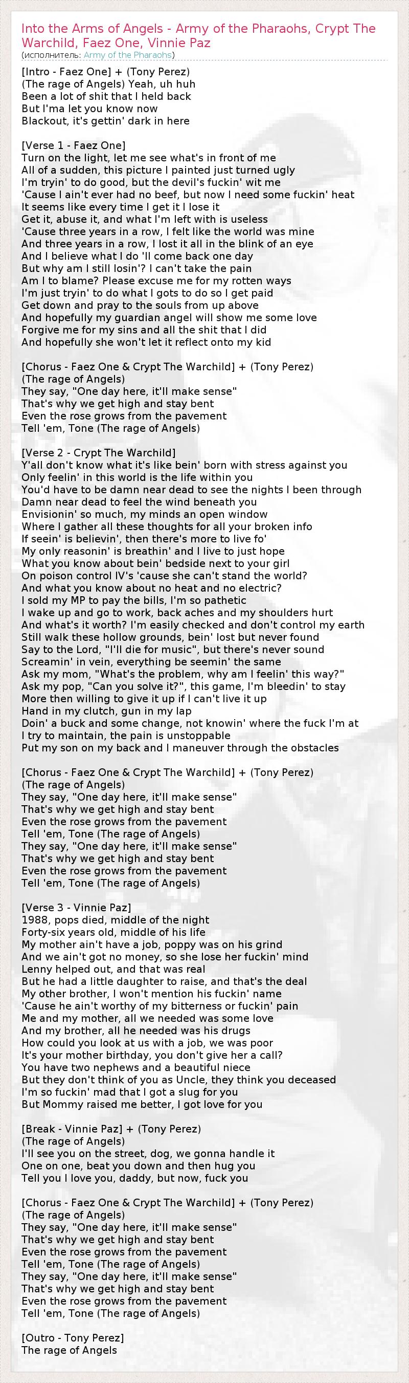[Intro - Faez One] + (Tony Perez) (The rage of Angels) Yeah, uh huh Been a lot of shit that I held back But I'ma let you know now Blackout, it's gettin' dark in here [Verse 1 - Faez One] Turn on the light, let me see what's in front of me All of a sudden, this picture I painted just turned ugly I'm tryin' to do good, but the devil's fuckin' wit me 'Cause I ain't ever had no beef, but now I need some fuckin' heat It seems like every time I get it I lose it Get it, abuse it, and what I'm left with is useless 'Cause three years in a row, I felt like the world was mine And three years in a row, I lost it all in the blink of an eye And I believe what I do 'll come back one day But why am I still losin'? I can't take the pain Am I to blame? Please excuse me for my rotten ways I'm just tryin' to do what I gots to do so I get paid Get down and pray to the souls from up above And hopefully my guardian angel will show me some love Forgive me for my sins and all the shit that I did And hopefully she won't let it reflect onto my kid [Chorus - Faez One & Crypt The Warchild] + (Tony Perez) (The rage of Angels) They say, "One day here, it'll make sense" That's why we get high and stay bent Even the rose grows from the pavement Tell 'em, Tone (The rage of Angels) [Verse 2 - Crypt The Warchild] Y'all don't know what it's like bein' born with stress against you Only feelin' in this world is the life within you You'd have to be damn near dead to see the nights I been through Damn near dead to feel the wind beneath you Envisionin' so much, my minds an open window Where I gather all these thoughts for all your broken info If seein' is believin', then there's more to live fo' My only reasonin' is breathin' and I live to just hope What you know about bein' bedside next to your girl On poison control IV's 'cause she can't stand the world? And what you know about no heat and no electric? I sold my MP to pay the bills, I'm so pathetic I wake up and go to work, back aches and my shoulders hurt And what's it worth? I'm easily checked and don't control my earth Still walk these hollow grounds, bein' lost but never found Say to the Lord, "I'll die for music", but there's never sound Screamin' in vein, everything be seemin' the same Ask my mom, "What's the problem, why am I feelin' this way?" Ask my pop, "Can you solve it?", this game, I'm bleedin' to stay More then willing to give it up if I can't live it up Hand in my clutch, gun in my lap Doin' a buck and some change, not knowin' where the fuck I'm at I try to maintain, the pain is unstoppable Put my son on my back and I maneuver through the obstacles [Chorus - Faez One & Crypt The Warchild] + (Tony Perez) (The rage of Angels) They say, "One day here, it'll make sense" That's why we get high and stay bent Even the rose grows from the pavement Tell 'em, Tone (The rage of Angels) They say, "One day here, it'll make sense" That's why we get high and stay bent Even the rose grows from the pavement Tell 'em, Tone (The rage of Angels) [Verse 3 - Vinnie Paz] 1988, pops died, middle of the night Forty-six years old, middle of his life My mother ain't have a job, poppy was on his grind And we ain't got no money, so she lose her fuckin' mind Lenny helped out, and that was real But he had a little daughter to raise, and that's the deal My other brother, I won't mention his fuckin' name 'Cause he ain't worthy of my bitterness or fuckin' pain Me and my mother, all we needed was some love And my brother, all he needed was his drugs How could you look at us with a job, we was poor It's your mother birthday, you don't give her a call? You have two nephews and a beautiful niece But they don't think of you as Uncle, they think you deceased I'm so fuckin' mad that I got a slug for you But Mommy raised me better, I got love for you [Break - Vinnie Paz] + (Tony Perez) (The rage of Angels) I'll see you on the street, dog, we gonna handle it One on one, beat you down and then hug you Tell you I love you, daddy, but now, fuck you [Chorus - Faez One & Crypt The Warchild] + (Tony Perez) (The rage of Angels) They say, "One day here, it'll make sense" That's why we get high and stay bent Even the rose grows from the pavement Tell 'em, Tone (The rage of Angels) They say, "One day here, it'll make sense" That's why we get high and stay bent Even the rose grows from the pavement Tell 'em, Tone (The rage of Angels) [Outro - Tony Perez] The rage of Angels