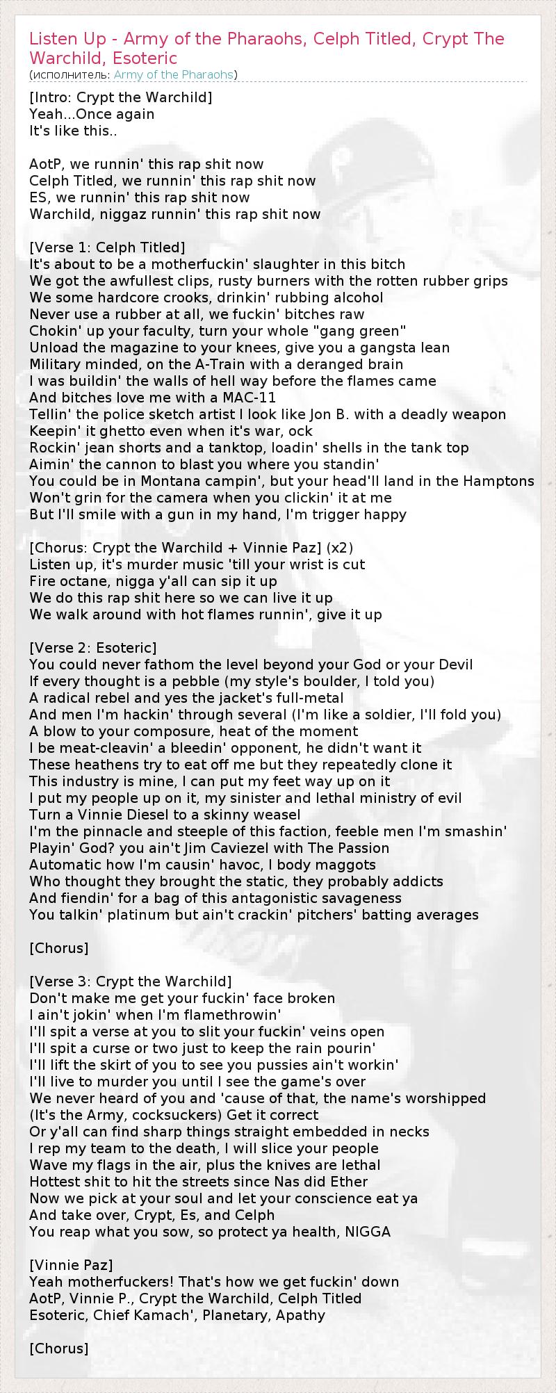 А как ты думаешь, о чем песня "Listen Up - Army of the Pharaohs, Celph Titled, Crypt The Warchild, Esoteric" ?