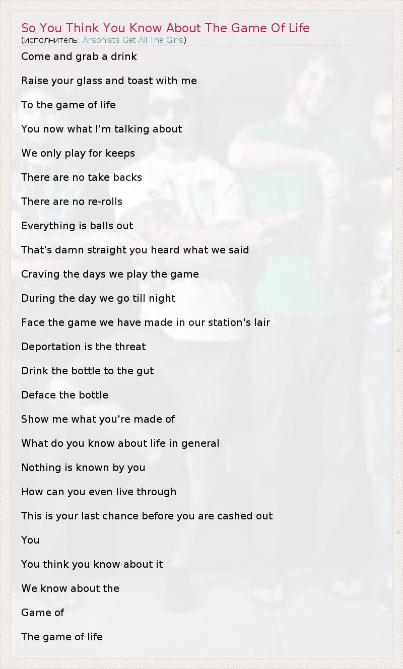 А как ты думаешь, о чем песня "So You Think You Know About The Game Of Life" ?