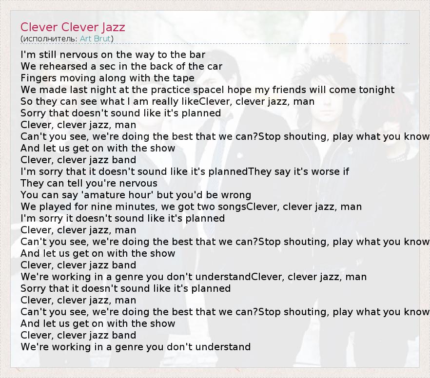 I'm still nervous on the way to the bar We rehearsed a sec in the back of the car Fingers moving along with the tape We made last night at the practice spaceI hope my friends will come tonight So they can see what I am really likeClever, clever jazz, man Sorry that doesn't sound like it's planned Clever, clever jazz, man Can't you see, we're doing the best that we can?Stop shouting, play what you know And let us get on with the show Clever, clever jazz band I'm sorry that it doesn't sound like it's plannedThey say it's worse if They can tell you're nervous You can say 'amature hour' but you'd be wrong We played for nine minutes, we got two songsClever, clever jazz, man I'm sorry it doesn't sound like it's planned Clever, clever jazz, man Can't you see, we're doing the best that we can?Stop shouting, play what you know And let us get on with the show Clever, clever jazz band We're working in a genre you don't understandClever, clever jazz, man Sorry that it doesn't sound like it's planned Clever, clever jazz, man Can't you see, we're doing the best that we can?Stop shouting, play what you know And let us get on with the show Clever, clever jazz band We're working in a genre you don't understand