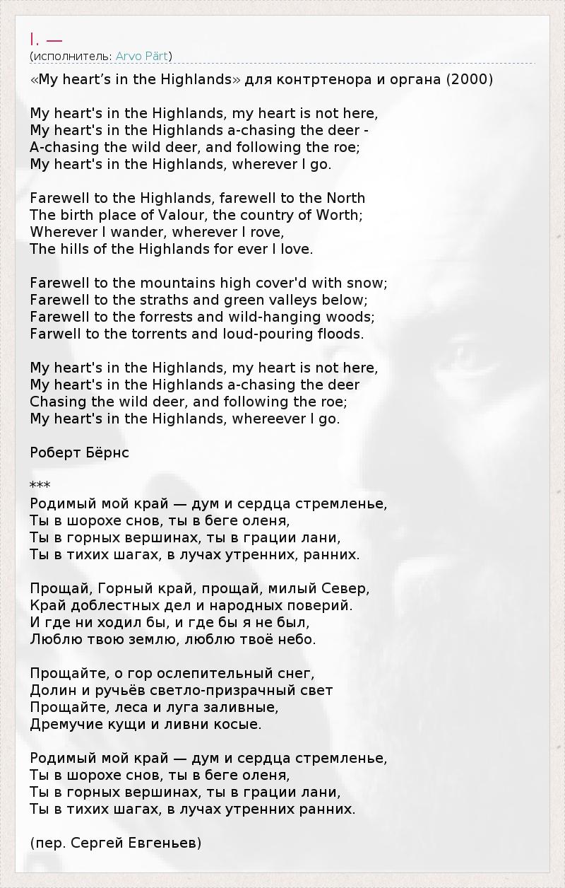 «My heart’s in the Highlands» для контртенора и органа (2000) My heart's in the Highlands, my heart is not here, My heart's in the Highlands a-chasing the deer - A-chasing the wild deer, and following the roe; My heart's in the Highlands, wherever I go. Farewell to the Highlands, farewell to the North The birth place of Valour, the country of Worth; Wherever I wander, wherever I rove, The hills of the Highlands for ever I love. Farewell to the mountains high cover'd with snow; Farewell to the straths and green valleys below; Farewell to the forrests and wild-hanging woods; Farwell to the torrents and loud-pouring floods. My heart's in the Highlands, my heart is not here, My heart's in the Highlands a-chasing the deer Chasing the wild deer, and following the roe; My heart's in the Highlands, whereever I go. Роберт Бёрнс *** Родимый мой край — дум и сердца стремленье, Ты в шорохе снов, ты в беге оленя, Ты в горных вершинах, ты в грации лани, Ты в тихих шагах, в лучах утренних, ранних. Прощай, Горный край, прощай, милый Север, Край доблестных дел и народных поверий. И где ни ходил бы, и где бы я не был, Люблю твою землю, люблю твоё небо. Прощайте, о гор ослепительный снег, Долин и ручьёв светло-призрачный свет Прощайте, леса и луга заливные, Дремучие кущи и ливни косые. Родимый мой край — дум и сердца стремленье, Ты в шорохе снов, ты в беге оленя, Ты в горных вершинах, ты в грации лани, Ты в тихих шагах, в лучах утренних ранних. (пер. Сергей Евгеньев)