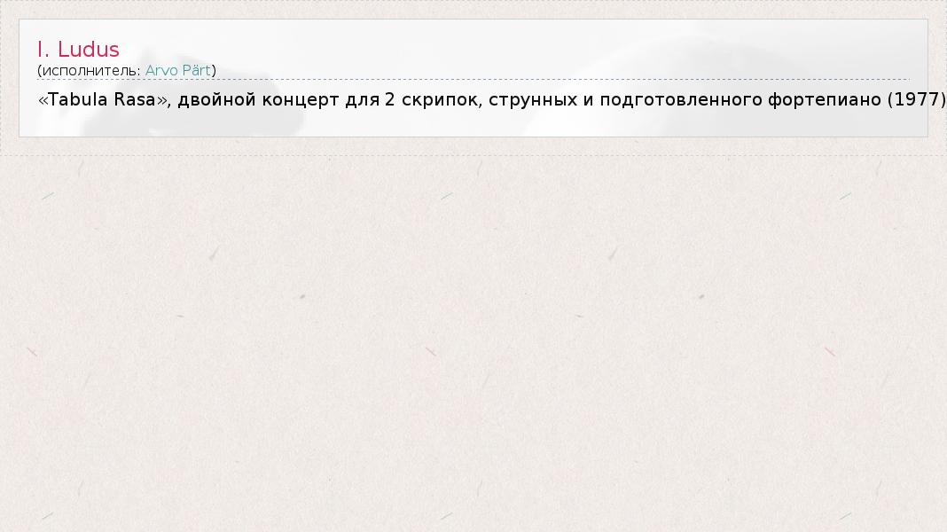 «Tabula Rasa», двойной концерт для 2 скрипок, струнных и подготовленного фортепиано (1977)