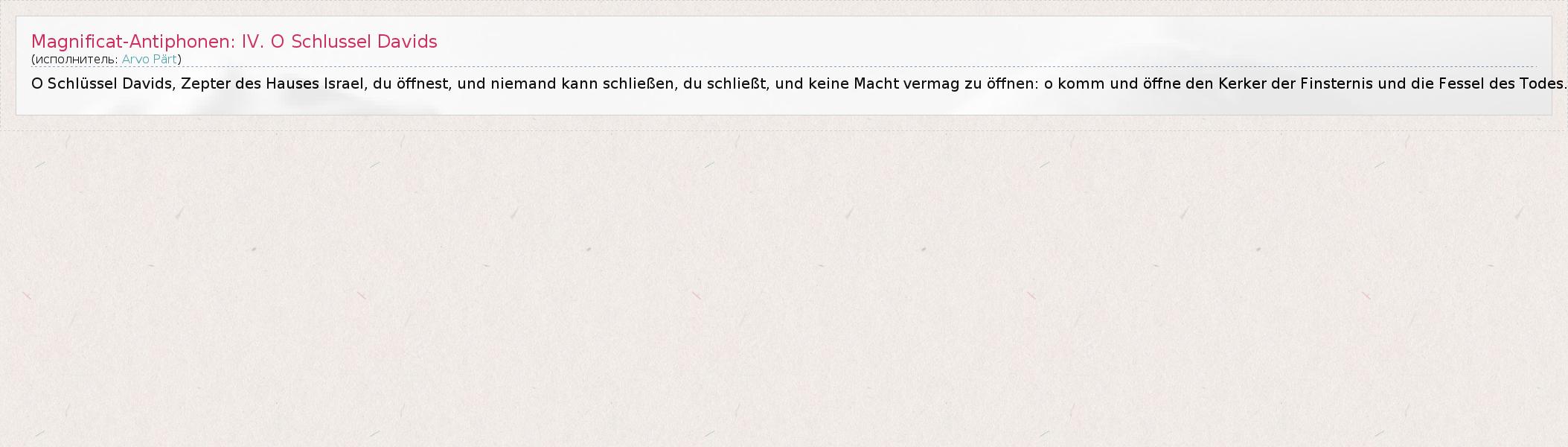 ГлавнаяИсполнителиArvo PärtMagnificat-Antiphonen: IV. O Schlussel Davids