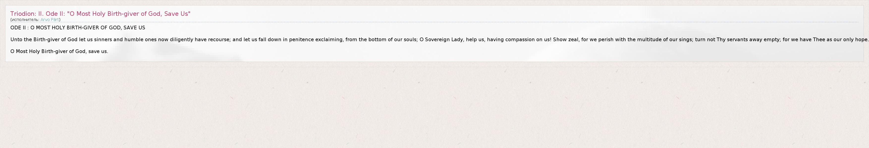 ГлавнаяИсполнителиArvo PärtTriodion: II. Ode II: "O Most Holy Birth-giver of God, Save Us"