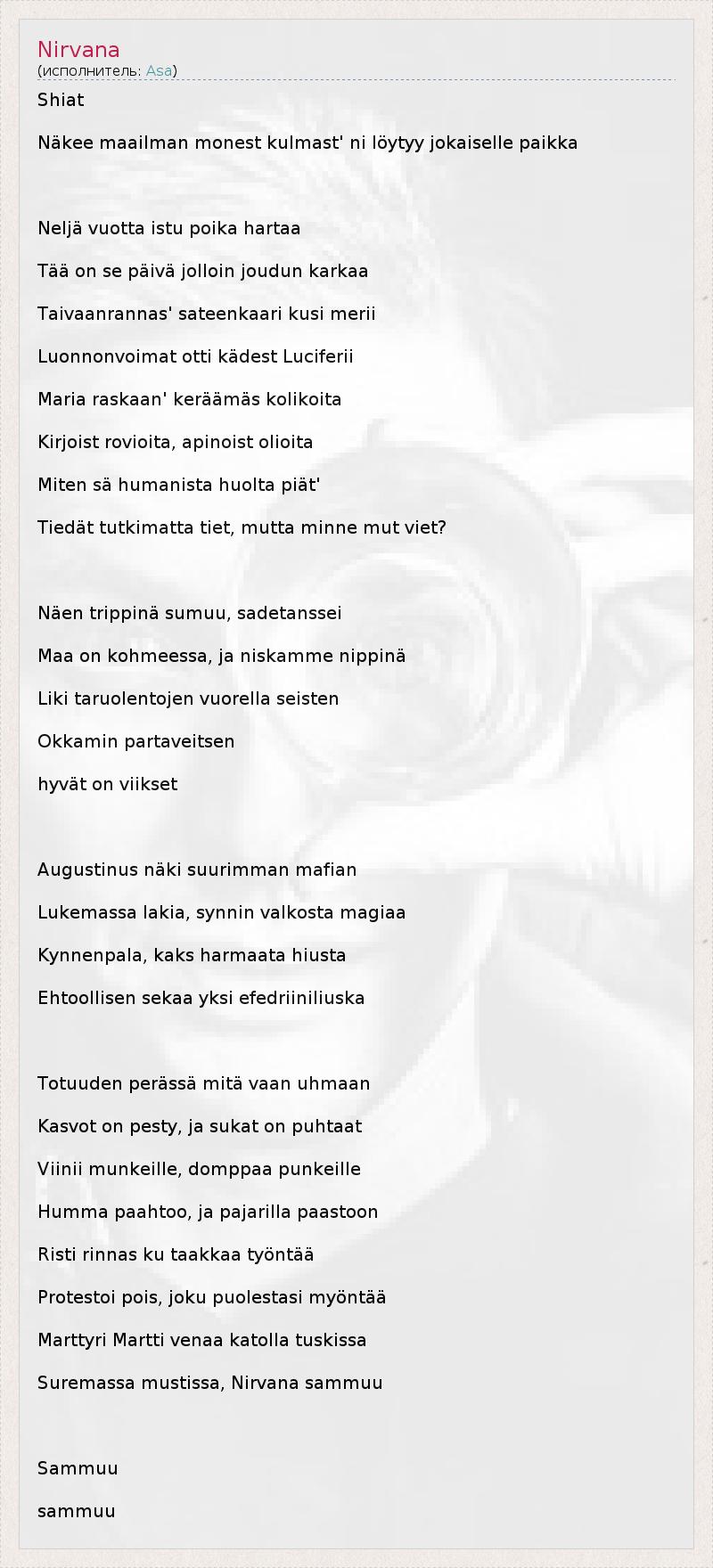 Shiat Näkee maailman monest kulmast' ni löytyy jokaiselle paikka Neljä vuotta istu poika hartaa Tää on se päivä jolloin joudun karkaa Taivaanrannas' sateenkaari kusi merii Luonnonvoimat otti kädest Luciferii Maria raskaan' keräämäs kolikoita Kirjoist rovioita, apinoist olioita Miten sä humanista huolta piät' Tiedät tutkimatta tiet, mutta minne mut viet? Näen trippinä sumuu, sadetanssei Maa on kohmeessa, ja niskamme nippinä Liki taruolentojen vuorella seisten Okkamin partaveitsen hyvät on viikset Augustinus näki suurimman mafian Lukemassa lakia, synnin valkosta magiaa Kynnenpala, kaks harmaata hiusta Ehtoollisen sekaa yksi efedriiniliuska Totuuden perässä mitä vaan uhmaan Kasvot on pesty, ja sukat on puhtaat Viinii munkeille, domppaa punkeille Humma paahtoo, ja pajarilla paastoon Risti rinnas ku taakkaa työntää Protestoi pois, joku puolestasi myöntää Marttyri Martti venaa katolla tuskissa Suremassa mustissa, Nirvana sammuu Sammuu sammuu