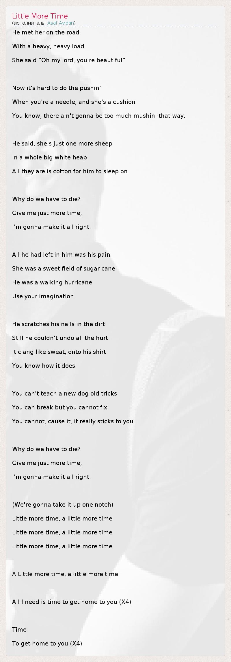 He met her on the road With a heavy, heavy load She said "Oh my lord, you're beautiful" Now it's hard to do the pushin' When you're a needle, and she's a cushion You know, there ain't gonna be too much mushin' that way. He said, she's just one more sheep In a whole big white heap All they are is cotton for him to sleep on. Why do we have to die? Give me just more time, I'm gonna make it all right. All he had left in him was his pain She was a sweet field of sugar cane He was a walking hurricane Use your imagination. He scratches his nails in the dirt Still he couldn't undo all the hurt It clang like sweat, onto his shirt You know how it does. You can't teach a new dog old tricks You can break but you cannot fix You cannot, cause it, it really sticks to you. Why do we have to die? Give me just more time, I'm gonna make it all right. (We're gonna take it up one notch) Little more time, a little more time Little more time, a little more time Little more time, a little more time A Little more time, a little more time All I need is time to get home to you (X4) Time To get home to you (X4)