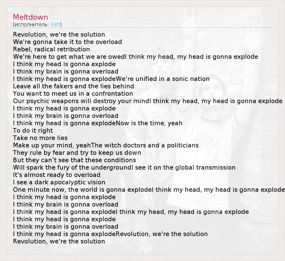 One minute now, the world is gonna explodeI think my head, my head is gonna explode