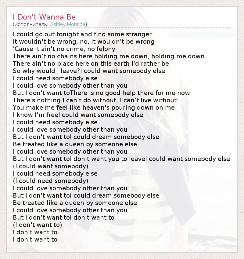 I could go out tonight and find some stranger It wouldn't be wrong, no, it wouldn't be wrong 'Cause it ain't no crime, no felony There ain't no chains here holding me down, holding me down There ain't no place here on this earth I'd rather be So why would I leave?I could want somebody else I could need somebody else I could love somebody other than you But I don't want toThere is no good help there for me now There's nothing I can't do without, I can't live without You make me feel like heaven's pouring down on me I know I'm freeI could want somebody else I could need somebody else I could love somebody other than you But I don't want toI could dream somebody else Be treated like a queen by someone else I could love somebody other than you But I don't want toI don't want you to leaveI could want somebody else (I could want somebody) I could need somebody else (I could need somebody) I could love somebody other than you But I don't want toI could dream somebody else Be treated like a queen by someone else I could love somebody other than you But I don't want toI don't want to (I don't want to) I don't want to I don't want to