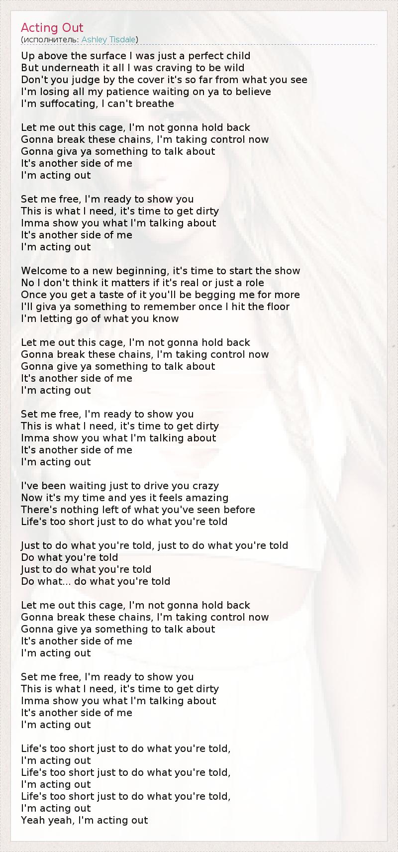 Up above the surface I was just a perfect child But underneath it all I was craving to be wild Don't you judge by the cover it's so far from what you see I'm losing all my patience waiting on ya to believe I'm suffocating, I can't breathe Let me out this cage, I'm not gonna hold back Gonna break these chains, I'm taking control now Gonna giva ya something to talk about It's another side of me I'm acting out Set me free, I'm ready to show you This is what I need, it's time to get dirty Imma show you what I'm talking about It's another side of me I'm acting out Welcome to a new beginning, it's time to start the show No I don't think it matters if it's real or just a role Once you get a taste of it you'll be begging me for more I'll giva ya something to remember once I hit the floor I'm letting go of what you know Let me out this cage, I'm not gonna hold back Gonna break these chains, I'm taking control now Gonna give ya something to talk about It's another side of me I'm acting out Set me free, I'm ready to show you This is what I need, it's time to get dirty Imma show you what I'm talking about It's another side of me I'm acting out I've been waiting just to drive you crazy Now it's my time and yes it feels amazing There's nothing left of what you've seen before Life's too short just to do what you're told Just to do what you're told, just to do what you're told Do what you're told Just to do what you're told Do what... do what you're told Let me out this cage, I'm not gonna hold back Gonna break these chains, I'm taking control now Gonna give ya something to talk about It's another side of me I'm acting out Set me free, I'm ready to show you This is what I need, it's time to get dirty Imma show you what I'm talking about It's another side of me I'm acting out Life's too short just to do what you're told, I'm acting out Life's too short just to do what you're told, I'm acting out Life's too short just to do what you're told, I'm acting out Yeah yeah, I'm acting out