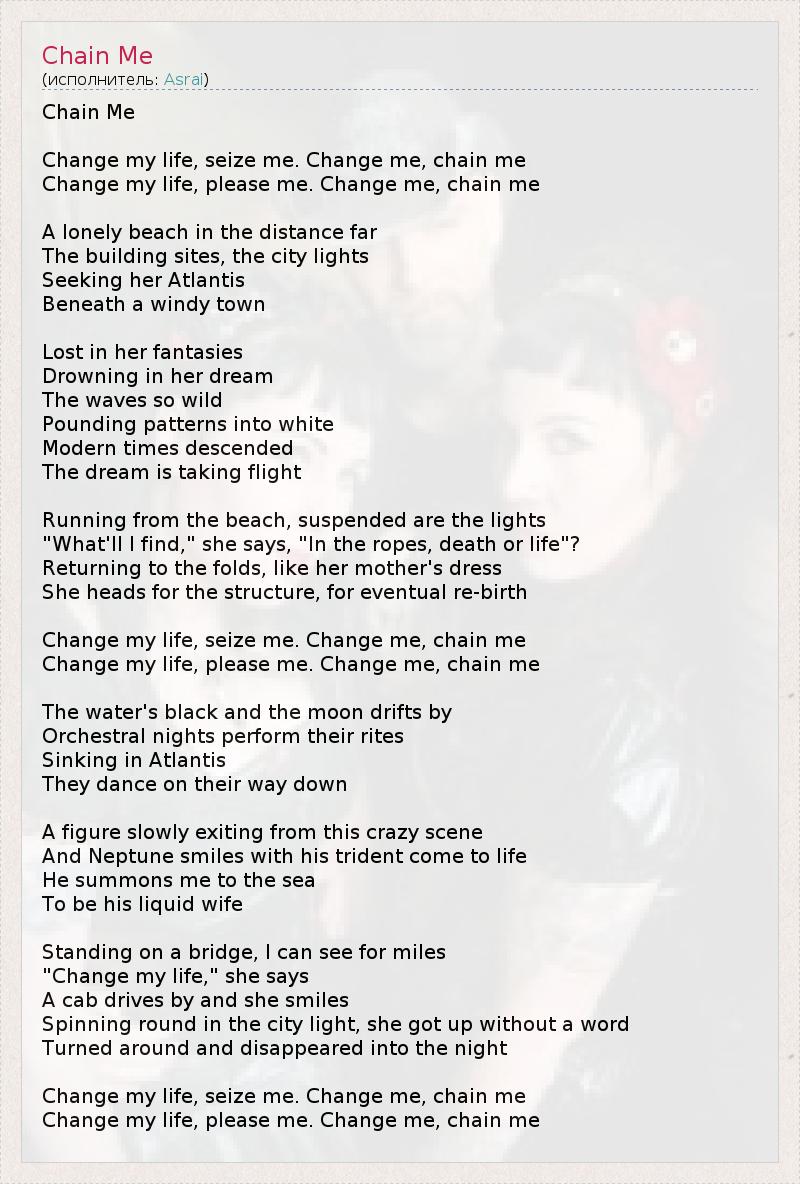 Chain Me Change my life, seize me. Change me, chain me Change my life, please me. Change me, chain me A lonely beach in the distance far The building sites, the city lights Seeking her Atlantis Beneath a windy town Lost in her fantasies Drowning in her dream The waves so wild Pounding patterns into white Modern times descended The dream is taking flight Running from the beach, suspended are the lights "What'll I find," she says, "In the ropes, death or life"? Returning to the folds, like her mother's dress She heads for the structure, for eventual re-birth Change my life, seize me. Change me, chain me Change my life, please me. Change me, chain me The water's black and the moon drifts by Orchestral nights perform their rites Sinking in Atlantis They dance on their way down A figure slowly exiting from this crazy scene And Neptune smiles with his trident come to life He summons me to the sea To be his liquid wife Standing on a bridge, I can see for miles "Change my life," she says A cab drives by and she smiles Spinning round in the city light, she got up without a word Turned around and disappeared into the night Change my life, seize me. Change me, chain me Change my life, please me. Change me, chain me