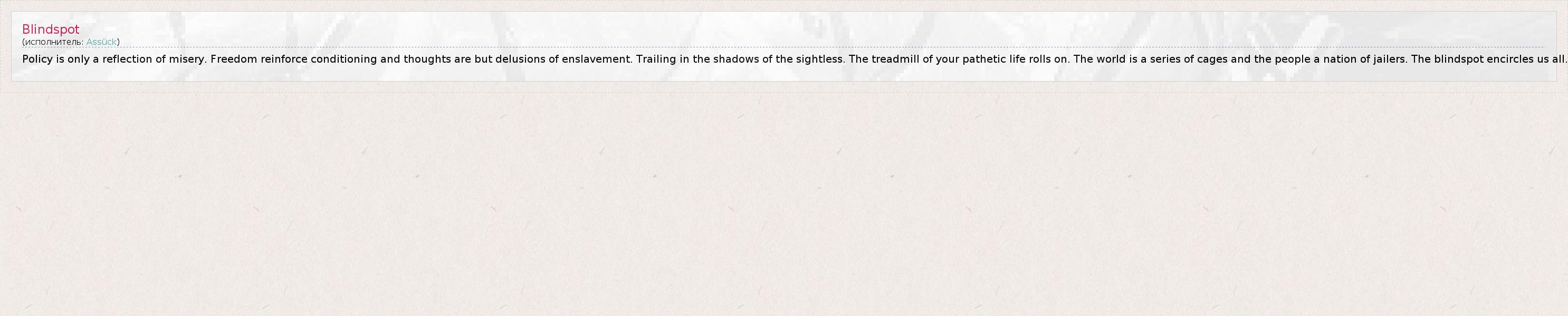 Policy is only a reflection of misery. Freedom reinforce conditioning and thoughts are but delusions of enslavement. Trailing in the shadows of the sightless. The treadmill of your pathetic life rolls on. The world is a series of cages and the people a nation of jailers. The blindspot encircles us all.