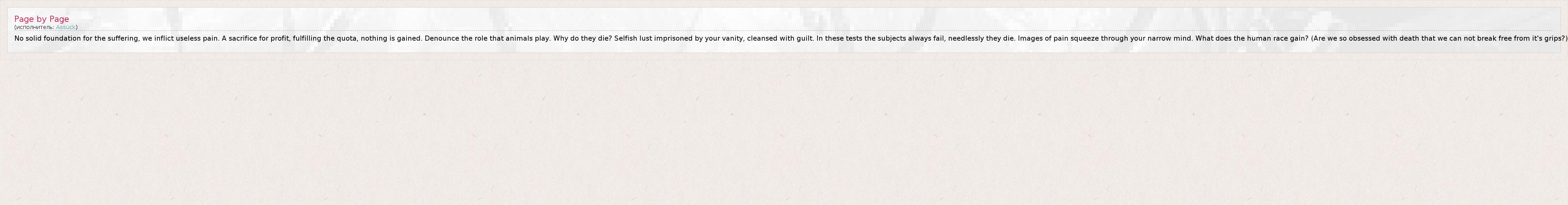 No solid foundation for the suffering, we inflict useless pain. A sacrifice for profit, fulfilling the quota, nothing is gained. Denounce the role that animals play. Why do they die? Selfish lust imprisoned by your vanity, cleansed with guilt. In these tests the subjects always fail, needlessly they die. Images of pain squeeze through your narrow mind. What does the human race gain? (Are we so obsessed with death that we can not break free from it's grips?)