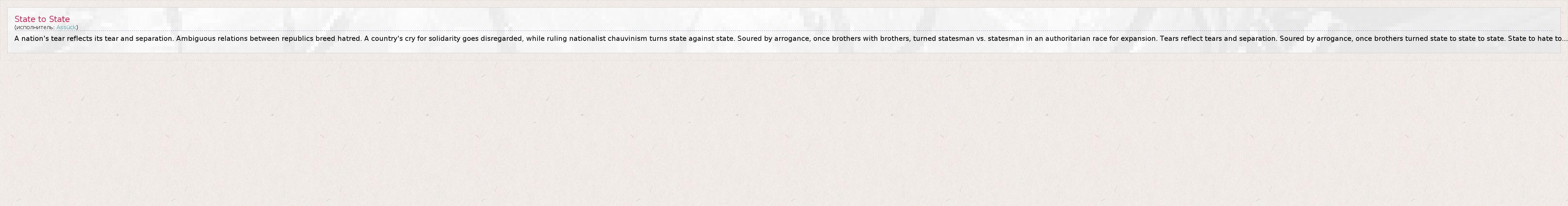 A nation's tear reflects its tear and separation. Ambiguous relations between republics breed hatred. A country's cry for solidarity goes disregarded, while ruling nationalist chauvinism turns state against state. Soured by arrogance, once brothers with brothers, turned statesman vs. statesman in an authoritarian race for expansion. Tears reflect tears and separation. Soured by arrogance, once brothers turned state to state to state. State to hate to...