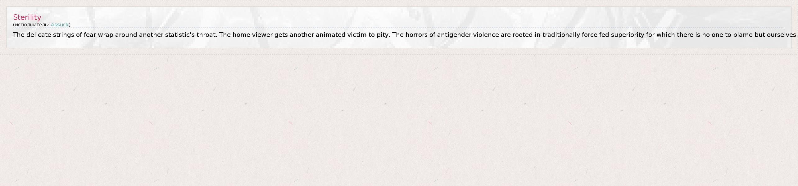 Это интересно:Assück - это американская грайндкор формация из созвучного нам городка St. Petersburg, что во Флориде. Группа была активна с 1987 по 1998 год и без преувеличения считается одним из самых ярких представителей флоридской сцены.Безусловно, на протяжении своего творческого пути они были одной из наиболее уважаемых и главных групп Северной Америки, сделали многое для D.I.Y. движения США и для всей сцены... продолжение