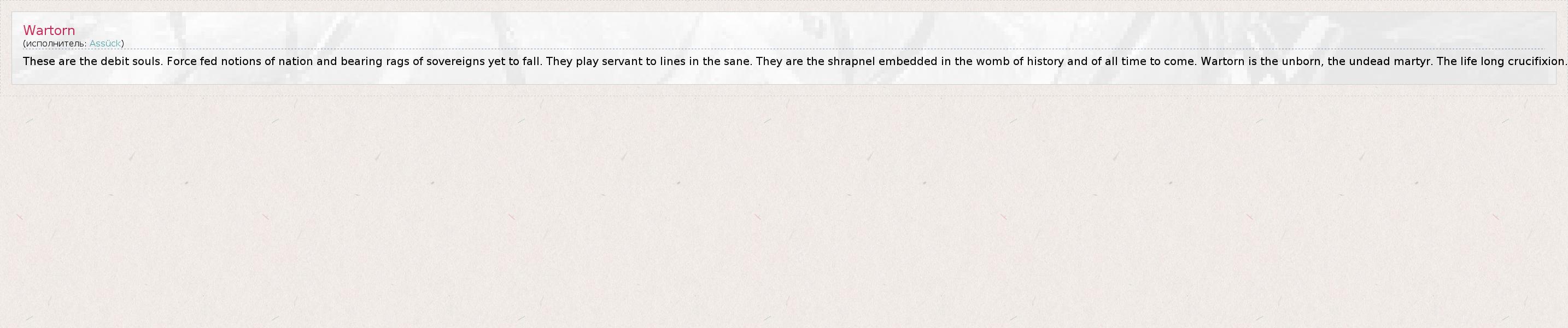 Это интересно:Assück - это американская грайндкор формация из созвучного нам городка St. Petersburg, что во Флориде. Группа была активна с 1987 по 1998 год и без преувеличения считается одним из самых ярких представителей флоридской сцены.Безусловно, на протяжении своего творческого пути они были одной из наиболее уважаемых и главных групп Северной Америки, сделали многое для D.I.Y. движения США и для всей сцены... продолжение