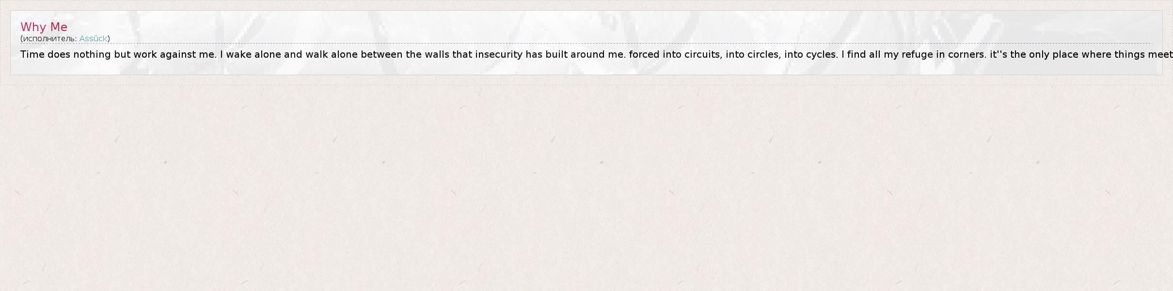 Time does nothing but work against me. I wake alone and walk alone between the walls that insecurity has built around me. forced into circuits, into circles, into cycles. I find all my refuge in corners. it''s the only place where things meet