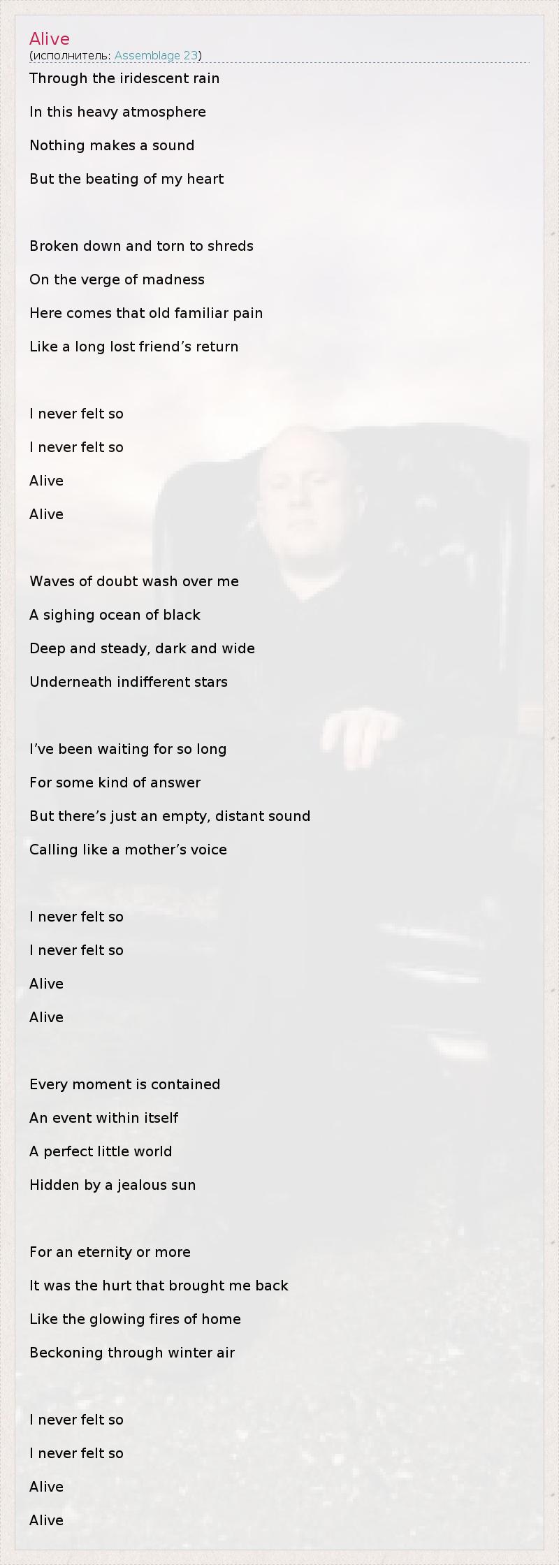 Through the iridescent rain In this heavy atmosphere Nothing makes a sound But the beating of my heart Broken down and torn to shreds On the verge of madness Here comes that old familiar pain Like a long lost friend’s return I never felt so I never felt so Alive Alive Waves of doubt wash over me A sighing ocean of black Deep and steady, dark and wide Underneath indifferent stars I’ve been waiting for so long For some kind of answer But there’s just an empty, distant sound Calling like a mother’s voice I never felt so I never felt so Alive Alive Every moment is contained An event within itself A perfect little world Hidden by a jealous sun For an eternity or more It was the hurt that brought me back Like the glowing fires of home Beckoning through winter air I never felt so I never felt so Alive Alive