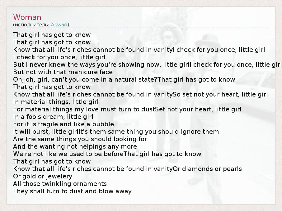 Oh, oh, girl, can't you come in a natural state?That girl has got to know