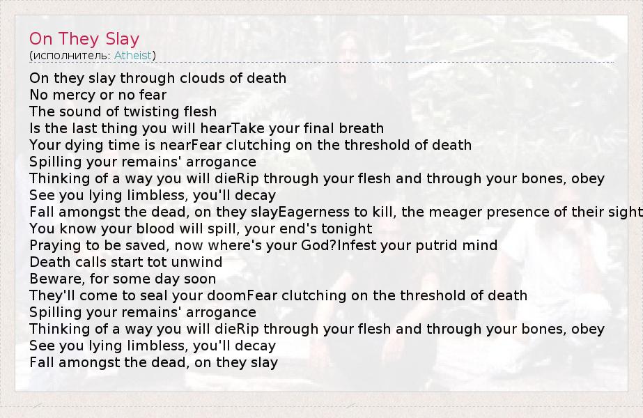 Fall amongst the dead, on they slayEagerness to kill, the meager presence of their sight