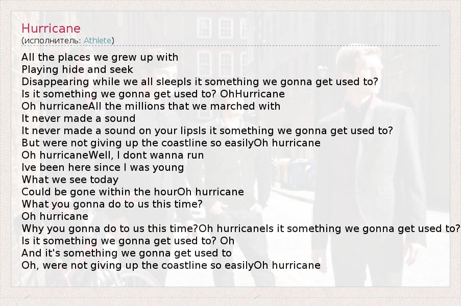 Why you gonna do to us this time?Oh hurricaneIs it something we gonna get used to?