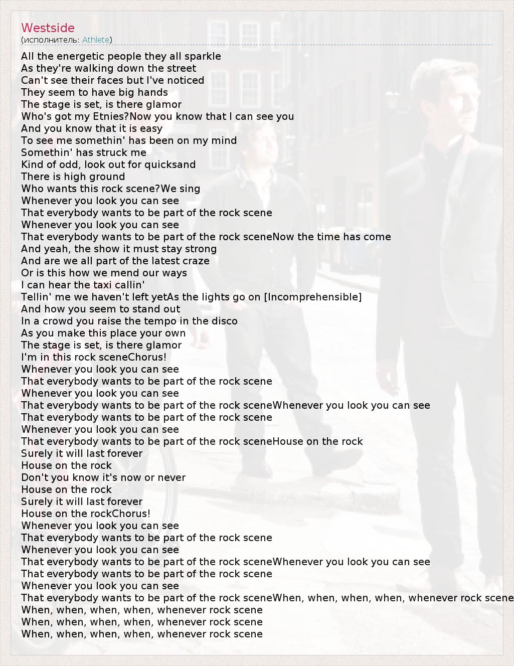 Это интересно:В активе лондонских рокеров Athlete четыре студийных альбома: дебютный "Vehicles & Animals", заработавший свое "золото" в Великобритании, "Tourist" и "Beyond the Neighbourhood", релиз которого состоялся в Великобритании 3 сентября 2007 года, Black Swan Релиз которого состоялся 24 Августа 2009 года и EP-2008 "The Outsiders". Они выставляют на всеобщее обозрение события, навеявшие новые песни (например,... продолжение