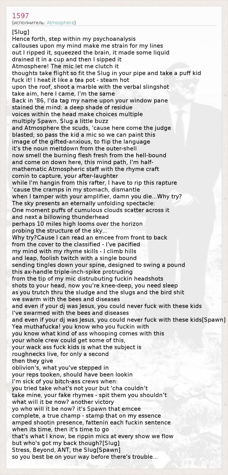 Это интересно:«Atmosphere» - одна из популярнейших групп в американском независимом хип-хопе. Группу создали в 1993-м году Sean Daley, известный как Slug и Spawn (Derek Turner, сейчас известный как «Rek The Heavyweight»). Последний покинул группу после выхода их первого альбома «Overcast!»В старших классах школы Sean Daley с другом Brent Sayer решили создать группу. Взяв для этой цели псевдонимы Slug (взял псевдоним от клички своего отца - Sluggo)... продолжение