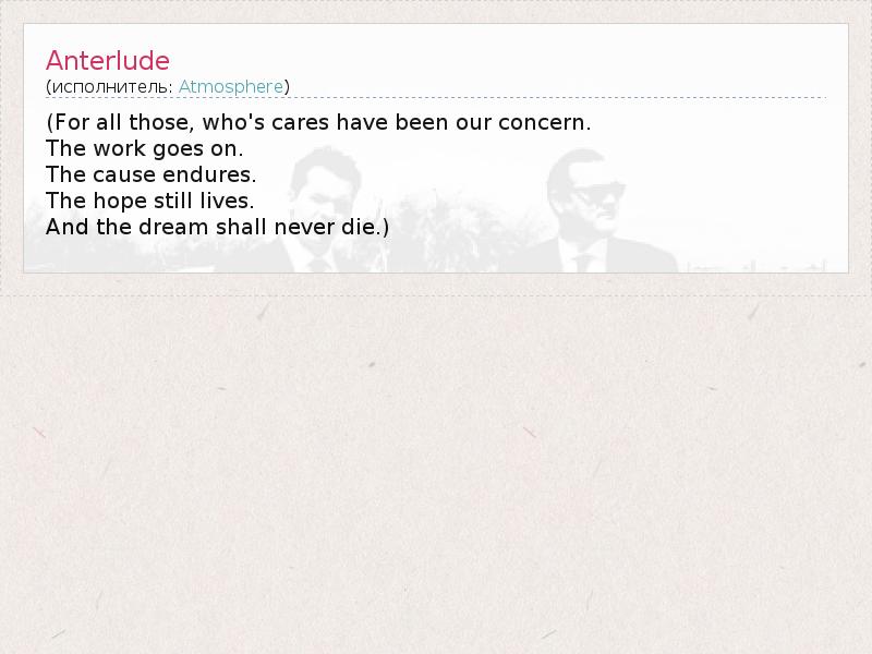 (For all those, who's cares have been our concern. The work goes on. The cause endures. The hope still lives. And the dream shall never die.)