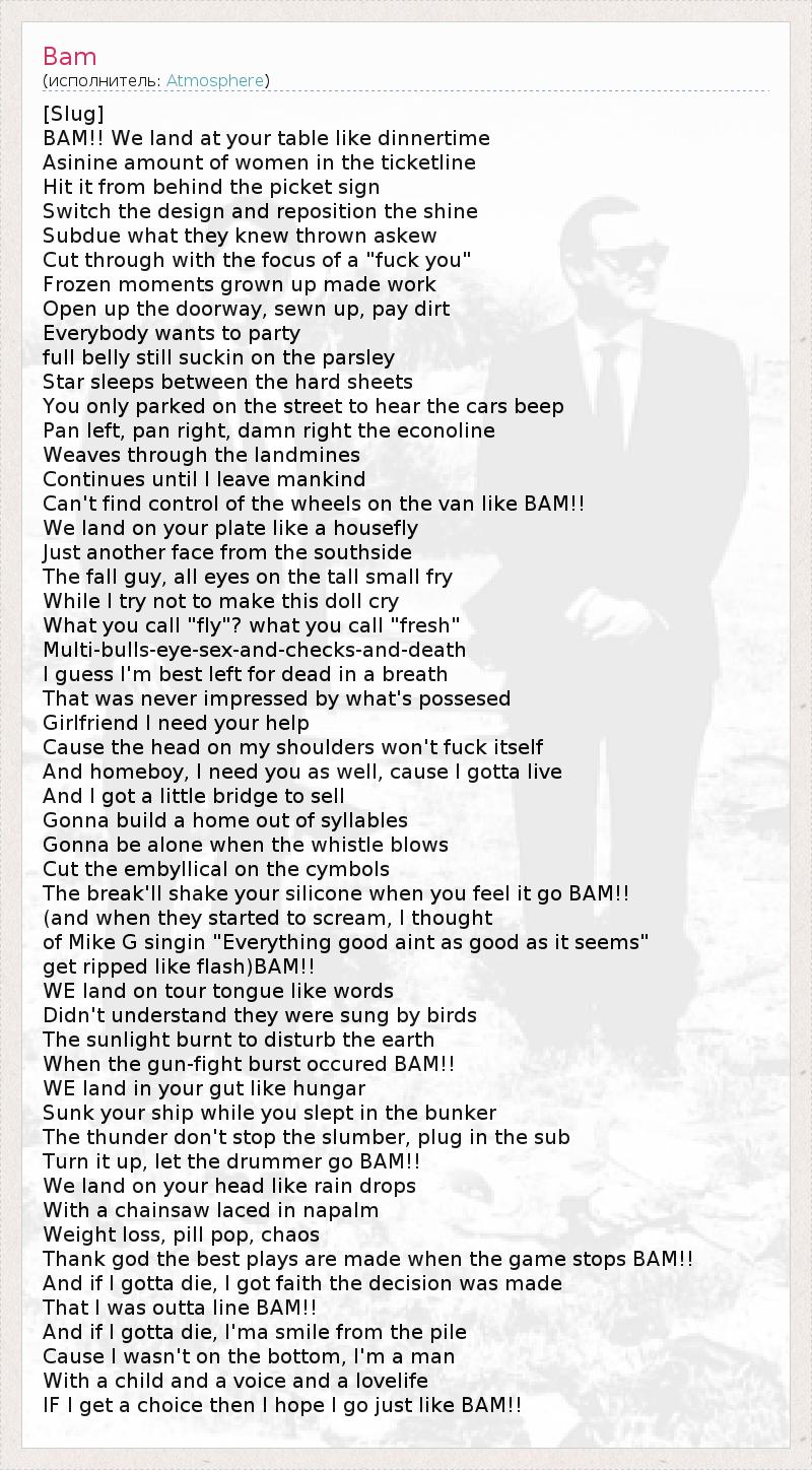 Это интересно:«Atmosphere» - одна из популярнейших групп в американском независимом хип-хопе. Группу создали в 1993-м году Sean Daley, известный как Slug и Spawn (Derek Turner, сейчас известный как «Rek The Heavyweight»). Последний покинул группу после выхода их первого альбома «Overcast!»В старших классах школы Sean Daley с другом Brent Sayer решили создать группу. Взяв для этой цели псевдонимы Slug (взял псевдоним от клички своего отца - Sluggo)... продолжение