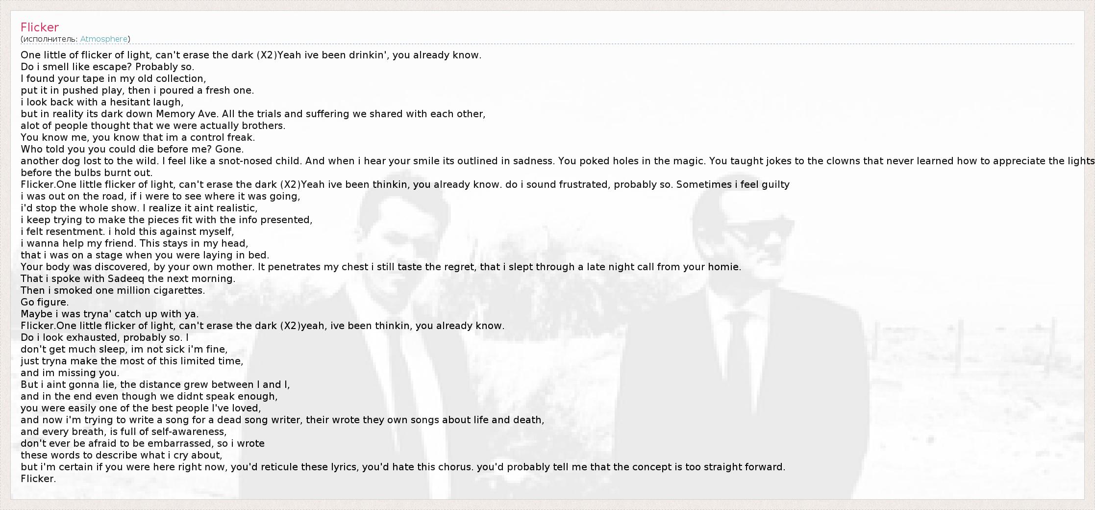 One little of flicker of light, can't erase the dark (X2)Yeah ive been drinkin', you already know. Do i smell like escape? Probably so. I found your tape in my old collection, put it in pushed play, then i poured a fresh one. i look back with a hesitant laugh, but in reality its dark down Memory Ave. All the trials and suffering we shared with each other, alot of people thought that we were actually brothers. You know me, you know that im a control freak. Who told you you could die before me? Gone. another dog lost to the wild. I feel like a snot-nosed child. And when i hear your smile its outlined in sadness. You poked holes in the magic. You taught jokes to the clowns that never learned how to appreciate the lights before the bulbs burnt out. Flicker.One little flicker of light, can't erase the dark (X2)Yeah ive been thinkin, you already know. do i sound frustrated, probably so. Sometimes i feel guilty i was out on the road, if i were to see where it was going, i'd stop the whole show. I realize it aint realistic, i keep trying to make the pieces fit with the info presented, i felt resentment. i hold this against myself, i wanna help my friend. This stays in my head, that i was on a stage when you were laying in bed. Your body was discovered, by your own mother. It penetrates my chest i still taste the regret, that i slept through a late night call from your homie. That i spoke with Sadeeq the next morning. Then i smoked one million cigarettes. Go figure. Maybe i was tryna' catch up with ya. Flicker.One little flicker of light, can't erase the dark (X2)yeah, ive been thinkin, you already know. Do i look exhausted, probably so. I don't get much sleep, im not sick i'm fine, just tryna make the most of this limited time, and im missing you. But i aint gonna lie, the distance grew between I and I, and in the end even though we didnt speak enough, you were easily one of the best people I've loved, and now i'm trying to write a song for a dead song writer, their wrote they own songs about life and death, and every breath, is full of self-awareness, don't ever be afraid to be embarrassed, so i wrote these words to describe what i cry about, but i'm certain if you were here right now, you'd reticule these lyrics, you'd hate this chorus. you'd probably tell me that the concept is too straight forward. Flicker.
