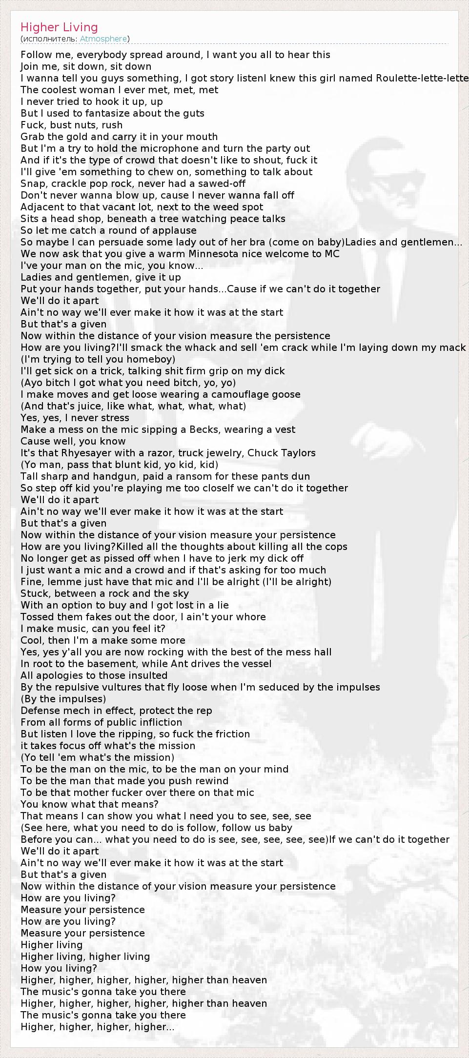 Follow me, everybody spread around, I want you all to hear this Join me, sit down, sit down I wanna tell you guys something, I got story listenI knew this girl named Roulette-lette-lette The coolest woman I ever met, met, met I never tried to hook it up, up But I used to fantasize about the guts Fuck, bust nuts, rush Grab the gold and carry it in your mouth But I'm a try to hold the microphone and turn the party out And if it's the type of crowd that doesn't like to shout, fuck it I'll give 'em something to chew on, something to talk about Snap, crackle pop rock, never had a sawed-off Don't never wanna blow up, cause I never wanna fall off Adjacent to that vacant lot, next to the weed spot Sits a head shop, beneath a tree watching peace talks So let me catch a round of applause So maybe I can persuade some lady out of her bra (come on baby)Ladies and gentlemen... We now ask that you give a warm Minnesota nice welcome to MC I've your man on the mic, you know... Ladies and gentlemen, give it up Put your hands together, put your hands...Cause if we can't do it together We'll do it apart Ain't no way we'll ever make it how it was at the start But that's a given Now within the distance of your vision measure the persistence How are you living?I'll smack the whack and sell 'em crack while I'm laying down my mack (I'm trying to tell you homeboy) I'll get sick on a trick, talking shit firm grip on my dick (Ayo bitch I got what you need bitch, yo, yo) I make moves and get loose wearing a camouflage goose (And that's juice, like what, what, what, what) Yes, yes, I never stress Make a mess on the mic sipping a Becks, wearing a vest Cause well, you know It's that Rhyesayer with a razor, truck jewelry, Chuck Taylors (Yo man, pass that blunt kid, yo kid, kid) Tall sharp and handgun, paid a ransom for these pants dun So step off kid you're playing me too closeIf we can't do it together We'll do it apart Ain't no way we'll ever make it how it was at the start But that's a given Now within the distance of your vision measure your persistence How are you living?Killed all the thoughts about killing all the cops No longer get as pissed off when I have to jerk my dick off I just want a mic and a crowd and if that's asking for too much Fine, lemme just have that mic and I'll be alright (I'll be alright) Stuck, between a rock and the sky With an option to buy and I got lost in a lie Tossed them fakes out the door, I ain't your whore I make music, can you feel it? Cool, then I'm a make some more Yes, yes y'all you are now rocking with the best of the mess hall In root to the basement, while Ant drives the vessel All apologies to those insulted By the repulsive vultures that fly loose when I'm seduced by the impulses (By the impulses) Defense mech in effect, protect the rep From all forms of public infliction But listen I love the ripping, so fuck the friction it takes focus off what's the mission (Yo tell 'em what's the mission) To be the man on the mic, to be the man on your mind To be the man that made you push rewind To be that mother fucker over there on that mic You know what that means? That means I can show you what I need you to see, see, see (See here, what you need to do is follow, follow us baby Before you can... what you need to do is see, see, see, see, see)If we can't do it together We'll do it apart Ain't no way we'll ever make it how it was at the start But that's a given Now within the distance of your vision measure your persistence How are you living? Measure your persistence How are you living? Measure your persistence Higher living Higher living, higher living How you living? Higher, higher, higher, higher, higher than heaven The music's gonna take you there Higher, higher, higher, higher, higher than heaven The music's gonna take you there Higher, higher, higher, higher...