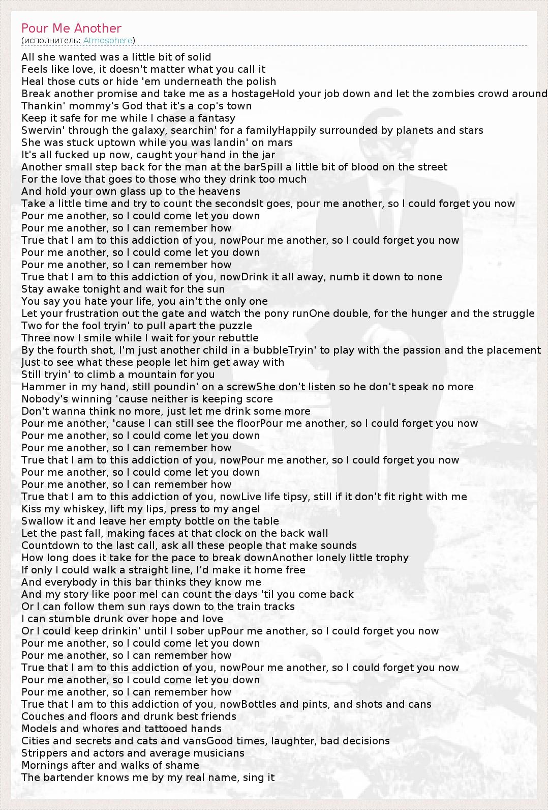 А как ты думаешь, о чем песня "Pour Me Another" ?