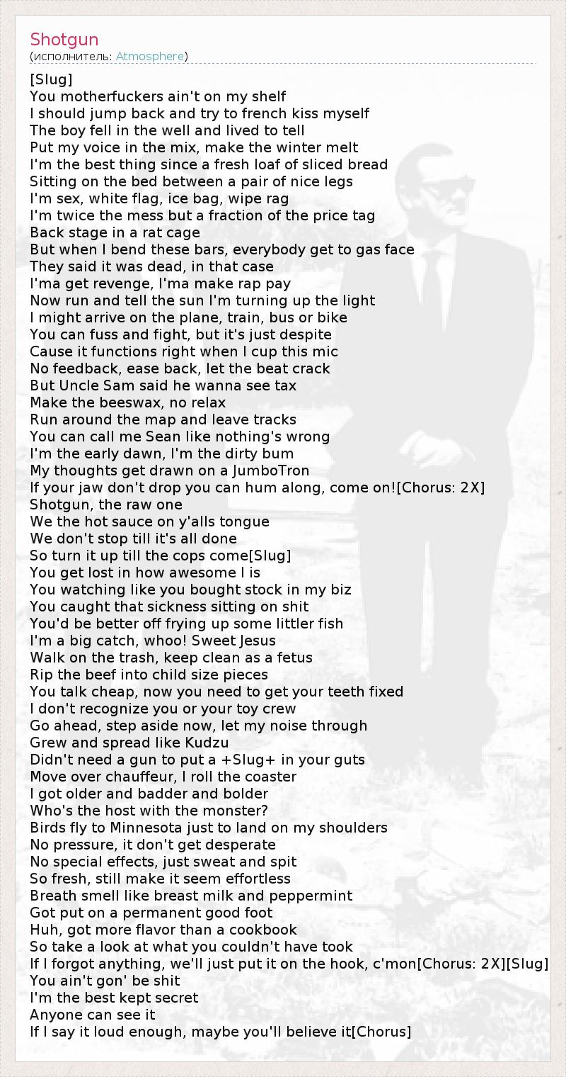 Это интересно:«Atmosphere» - одна из популярнейших групп в американском независимом хип-хопе. Группу создали в 1993-м году Sean Daley, известный как Slug и Spawn (Derek Turner, сейчас известный как «Rek The Heavyweight»). Последний покинул группу после выхода их первого альбома «Overcast!»В старших классах школы Sean Daley с другом Brent Sayer решили создать группу. Взяв для этой цели псевдонимы Slug (взял псевдоним от клички своего отца - Sluggo)... продолжение