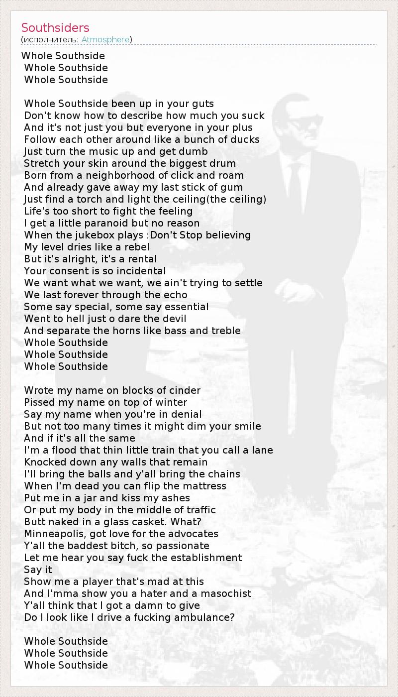 Whole Southside Whole Southside Whole Southside Whole Southside been up in your guts Don't know how to describe how much you suck And it's not just you but everyone in your plus Follow each other around like a bunch of ducks Just turn the music up and get dumb Stretch your skin around the biggest drum Born from a neighborhood of click and roam And already gave away my last stick of gum Just find a torch and light the ceiling(the ceiling) Life's too short to fight the feeling I get a little paranoid but no reason When the jukebox plays :Don't Stop believing My level dries like a rebel But it's alright, it's a rental Your consent is so incidental We want what we want, we ain't trying to settle We last forever through the echo Some say special, some say essential Went to hell just o dare the devil And separate the horns like bass and treble Whole Southside Whole Southside Whole Southside Wrote my name on blocks of cinder Pissed my name on top of winter Say my name when you're in denial But not too many times it might dim your smile And if it's all the same I'm a flood that thin little train that you call a lane Knocked down any walls that remain I'll bring the balls and y'all bring the chains When I'm dead you can flip the mattress Put me in a jar and kiss my ashes Or put my body in the middle of traffic Butt naked in a glass casket. What? Minneapolis, got love for the advocates Y'all the baddest bitch, so passionate Let me hear you say fuck the establishment Say it Show me a player that's mad at this And I'mma show you a hater and a masochist Y'all think that I got a damn to give Do I look like I drive a fucking ambulance? Whole Southside Whole Southside Whole Southside