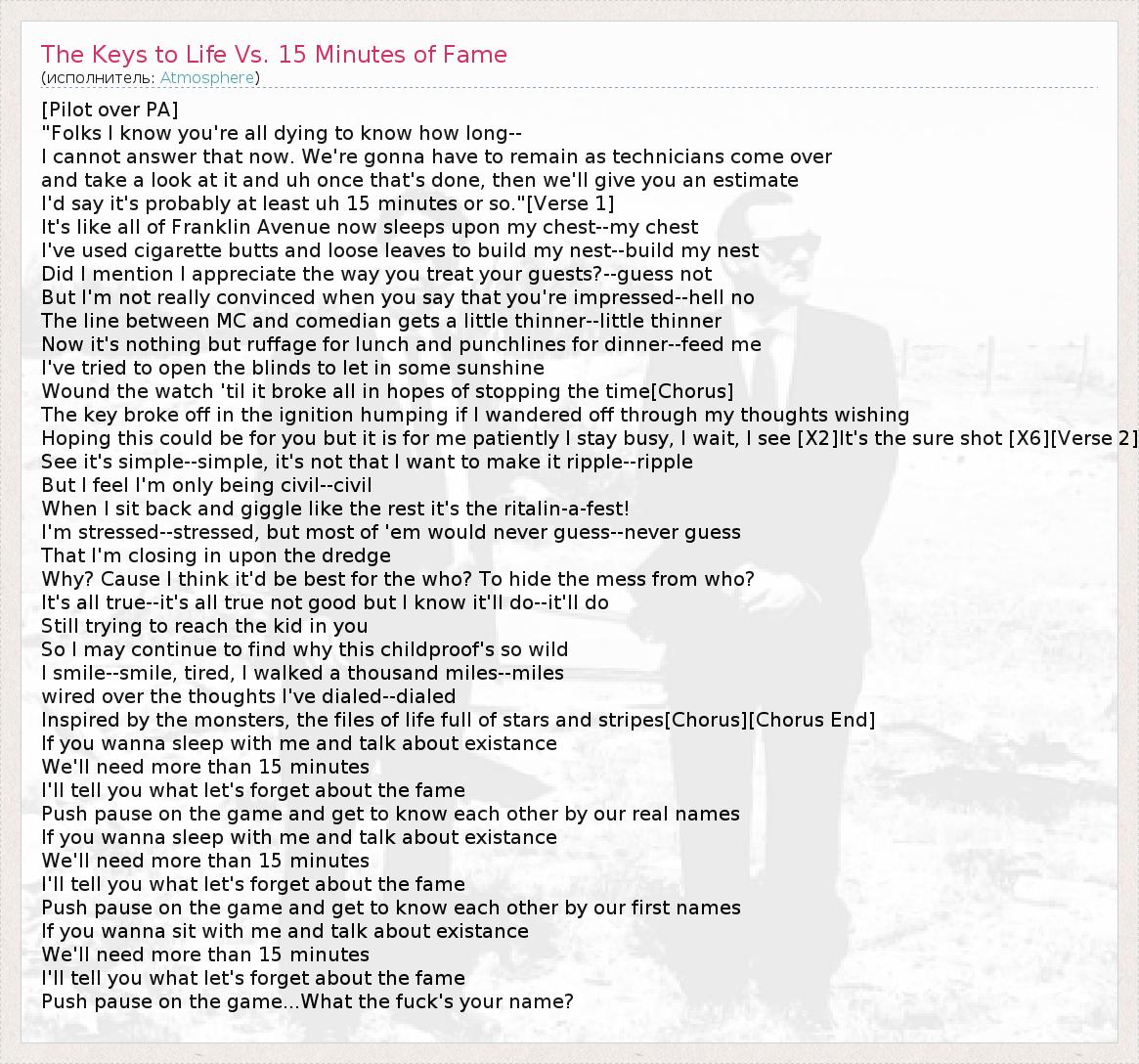 ГлавнаяИсполнителиAtmosphereThe Keys to Life Vs. 15 Minutes of Fame
