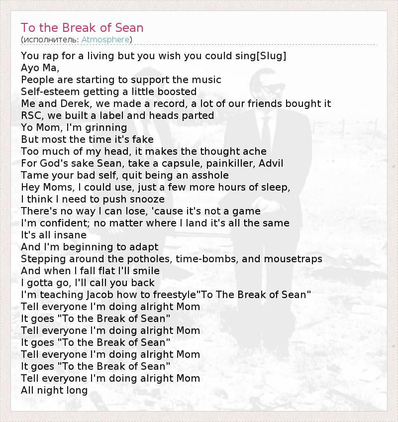 You rap for a living but you wish you could sing[Slug] Ayo Ma, People are starting to support the music Self-esteem getting a little boosted Me and Derek, we made a record, a lot of our friends bought it RSC, we built a label and heads parted Yo Mom, I'm grinning But most the time it's fake Too much of my head, it makes the thought ache For God's sake Sean, take a capsule, painkiller, Advil Tame your bad self, quit being an asshole Hey Moms, I could use, just a few more hours of sleep, I think I need to push snooze There's no way I can lose, 'cause it's not a game I'm confident; no matter where I land it's all the same It's all insane And I'm beginning to adapt Stepping around the potholes, time-bombs, and mousetraps And when I fall flat I'll smile I gotta go, I'll call you back I'm teaching Jacob how to freestyle"To The Break of Sean" Tell everyone I'm doing alright Mom It goes "To the Break of Sean" Tell everyone I'm doing alright Mom It goes "To the Break of Sean" Tell everyone I'm doing alright Mom It goes "To the Break of Sean" Tell everyone I'm doing alright Mom All night long