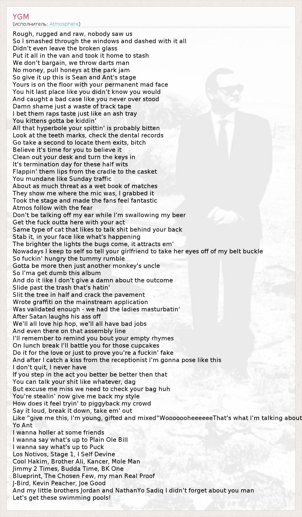 Rough, rugged and raw, nobody saw us So I smashed through the windows and dashed with it all Didn't even leave the broken glass Put it all in the van and took it home to stash We don't bargain, we throw darts man No money, pull honeys at the park jam So give it up this is Sean and Ant's stage Yours is on the floor with your permanent mad face You hit last place like you didn't know you would And caught a bad case like you never over stood Damn shame just a waste of track tape I bet them raps taste just like an ash tray You kittens gotta be kiddin' All that hyperbole your spittin' is probably bitten Look at the teeth marks, check the dental records Go take a second to locate them exits, bitch Believe it's time for you to believe it Clean out your desk and turn the keys in It's termination day for these half wits Flappin' them lips from the cradle to the casket You mundane like Sunday traffic About as much threat as a wet book of matches They show me where the mic was, I grabbed it Took the stage and made the fans feel fantastic Atmos follow with the fear Don't be talking off my ear while I'm swallowing my beer Get the fuck outta here with your act Same type of cat that likes to talk shit behind your back Stab it, in your face like what's happening The brighter the lights the bugs come, it attracts em' Nowadays I keep to self so tell your girlfriend to take her eyes off of my belt buckle So fuckin' hungry the tummy rumble Gotta be more then just another monkey's uncle So I'ma get dumb this album And do it like I don't give a damn about the outcome Slide past the trash that's hatin' Slit the tree in half and crack the pavement Wrote graffiti on the mainstream application Was validated enough - we had the ladies masturbatin' After Satan laughs his ass off We'll all love hip hop, we'll all have bad jobs And even there on that assembly line I'll remember to remind you bout your empty rhymes On lunch break I'll battle you for those cupcakes Do it for the love or just to prove you're a fuckin' fake And after I catch a kiss from the receptionist I'm gonna pose like this I don't quit, I never have If you step in the act you better be better then that You can talk your shit like whatever, dag But excuse me miss we need to check your bag huh You're stealin' now give me back my style How does it feel tryin' to piggyback my crowd Say it loud, break it down, take em' out Like "give me this, I'm young, gifted and mixed"WooooooheeeeeeThat's what I'm talking about Yo Ant I wanna holler at some friends I wanna say what's up to Plain Ole Bill I wanna say what's up to Puck Los Notivos, Stage 1, I Self Devine Cool Hakim, Brother Ali, Kancer, Mole Man Jimmy 2 Times, Budda Time, BK One Blueprint, The Chosen Few, my man Real Proof J-Bird, Kevin Peacher, Joe Good And my little brothers Jordan and NathanYo Sadiq I didn't forget about you man Let's get these swimming pools!